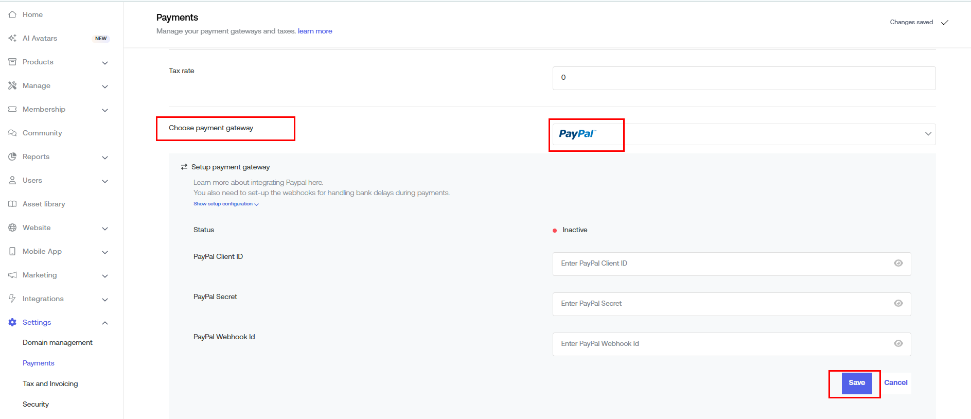 Under the "Payment Gateway" select "Paypal". If you want to charge tax, click on "GST", "VAT", or click on "No Tax". If you want to charge tax, enter the percentage charged under "Default Tax Rate".