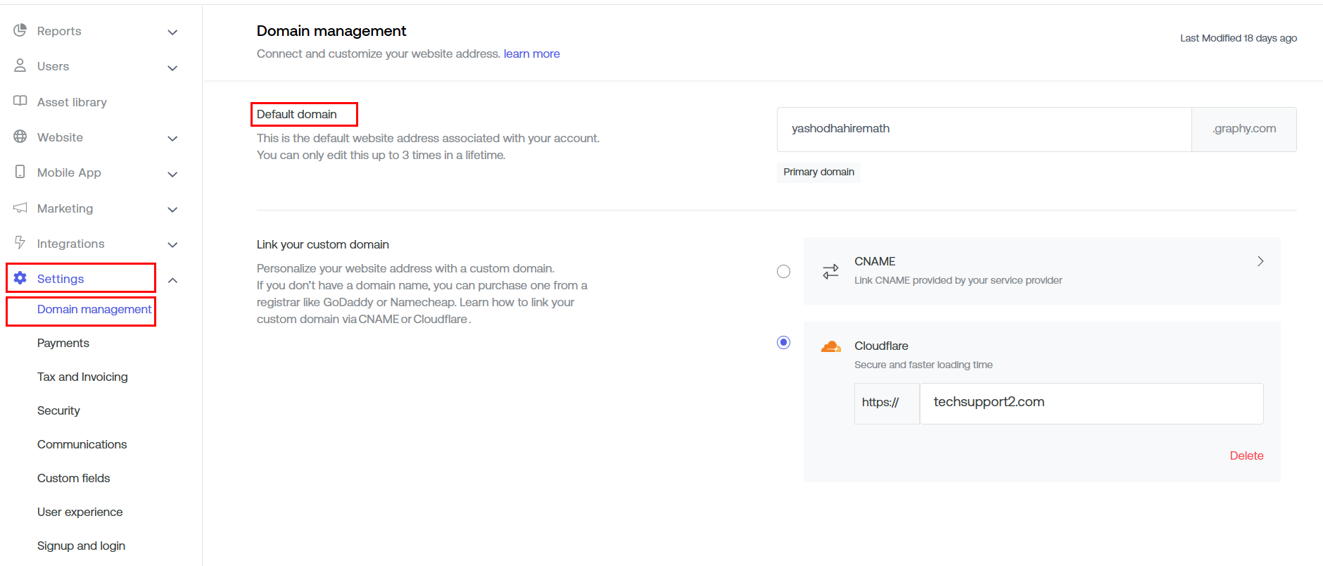 Step 1: Go to Settings->Domain Management.