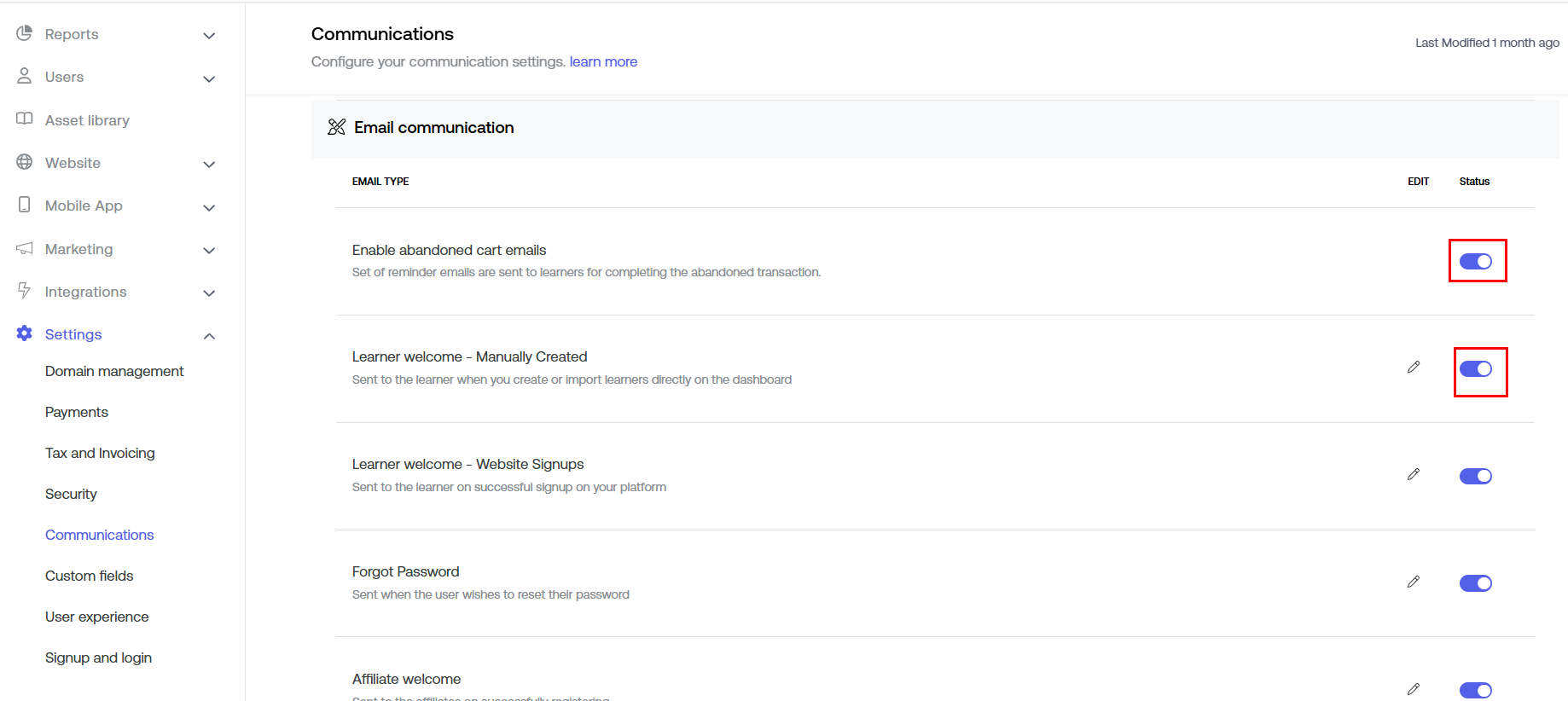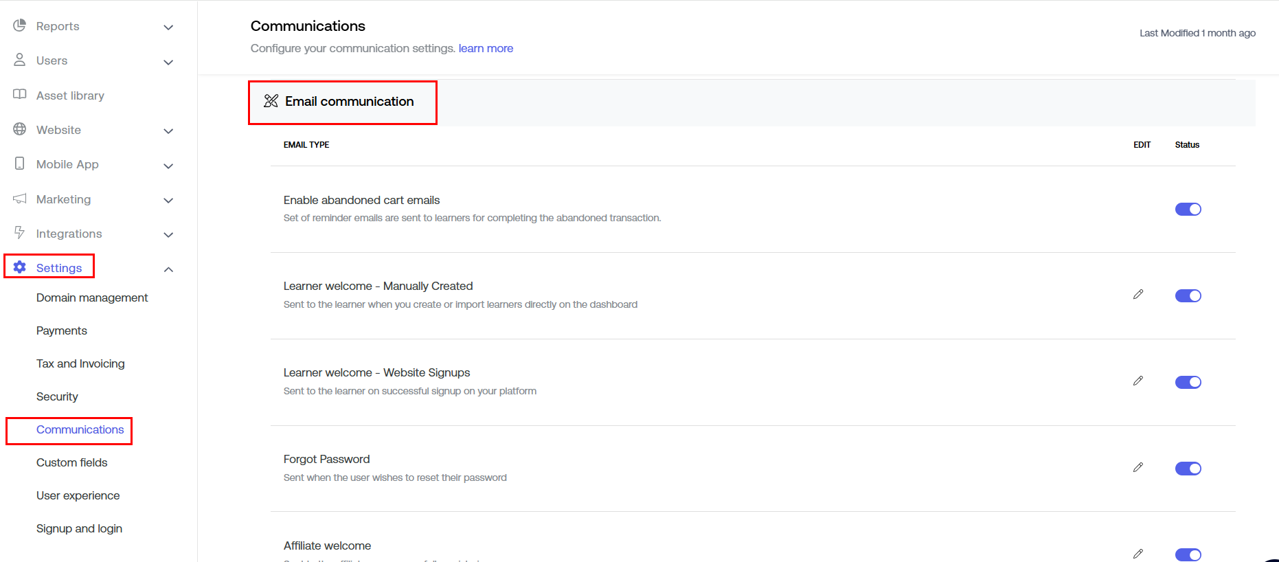 Visit your Dashboard, scroll down and select Settings > Communications. Now, click on "Email Communication" to edit the whole e-mail settings.