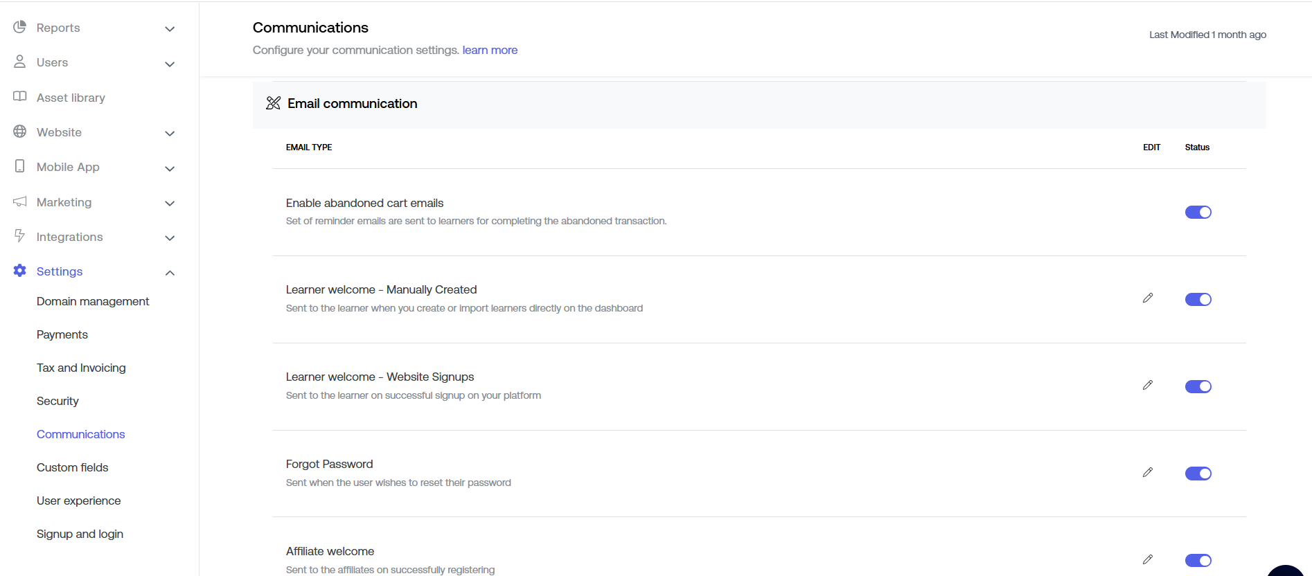 E-mail templates are standard e-mails that are sent to your learners or affiliates on different occasions when they do certain things. Within the Seekhly course platform, you can send automatic e-mails for the below ten occasions:
