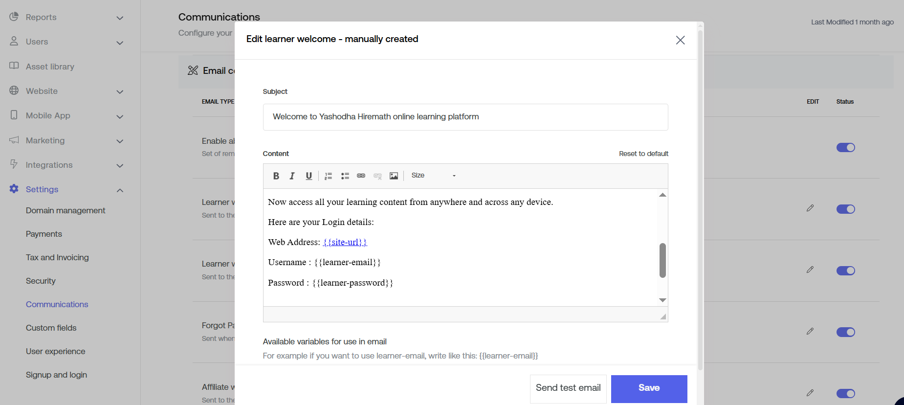You can test the changes made by entering an e-mail id towards the right section of the template, and clicking on "Send".