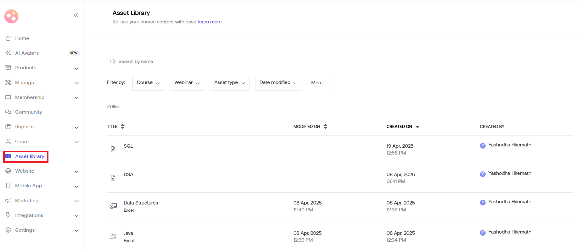 Note: To view items in the Asset Library, you must upload content in any course. In order to see the course associated with it, you have to save the course. All the webinar recordings get added to the asset library by default. To delete an asset, it must first be removed from any courses where it has been added. Only then can it be deleted from the asset library.