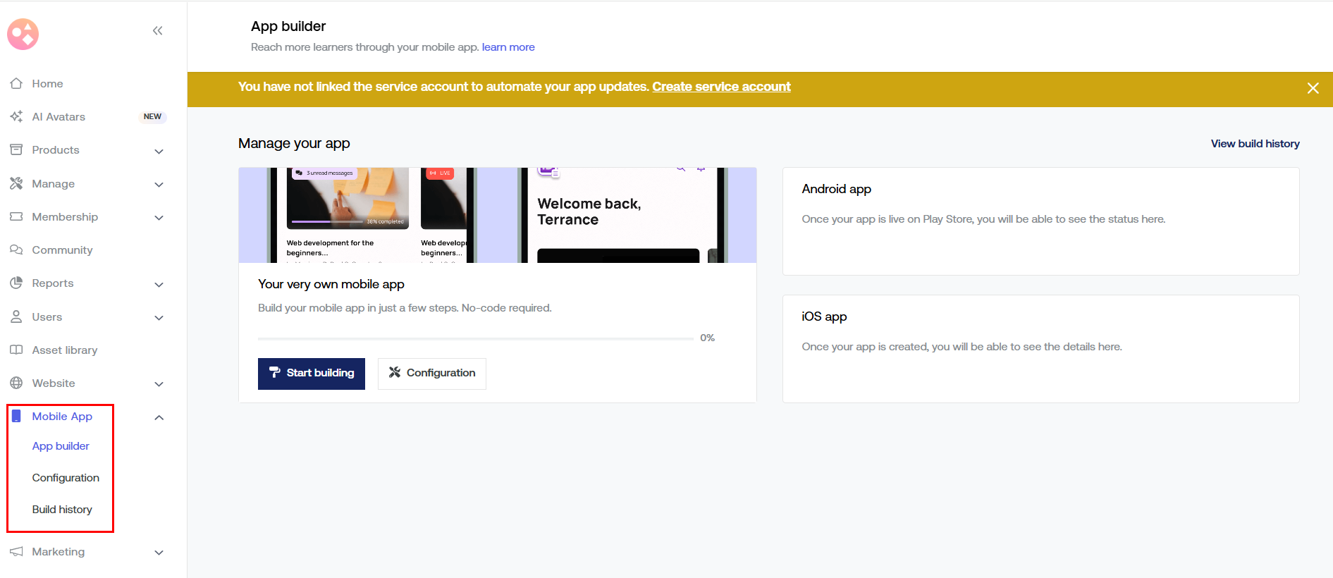 - Configuration: Tailor the mobile app experience for your users by choosing the landing screen, managing learner permissions, and creating categories on the home page. You can customize app settings separately for iOS and Android.