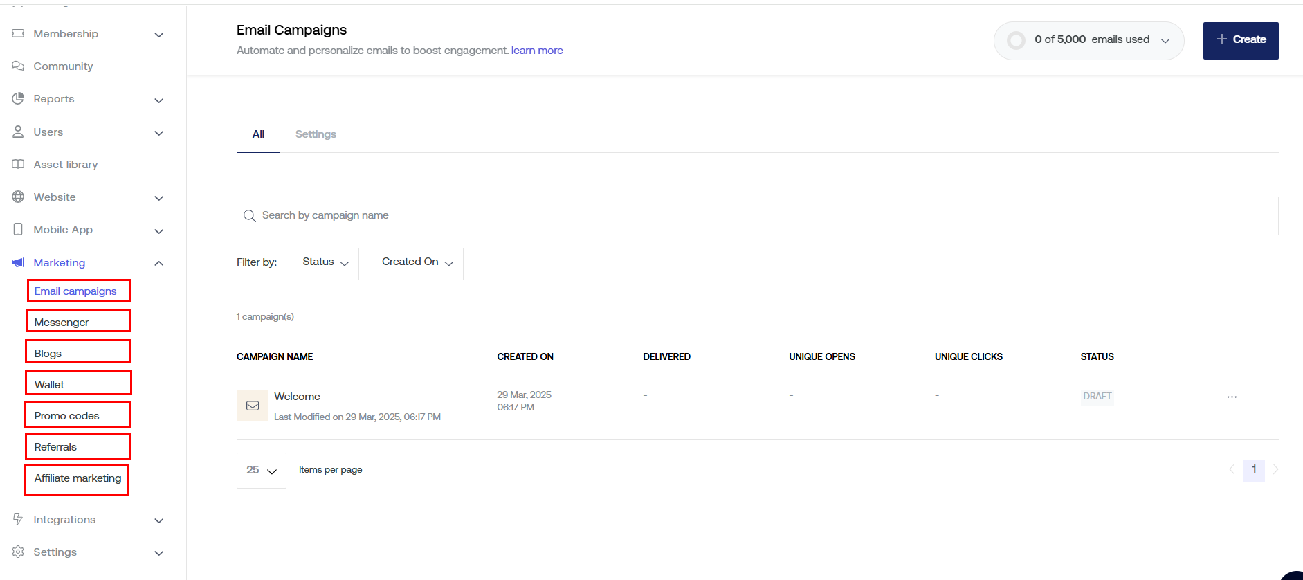 - Email Campaigns: This feature enables you to send a series of targeted emails to learners, useful for notifications about sales, offers, or onboarding. You can create sequences, set entry and exit conditions, and schedule emails to enhance communication and engagement with your audience.