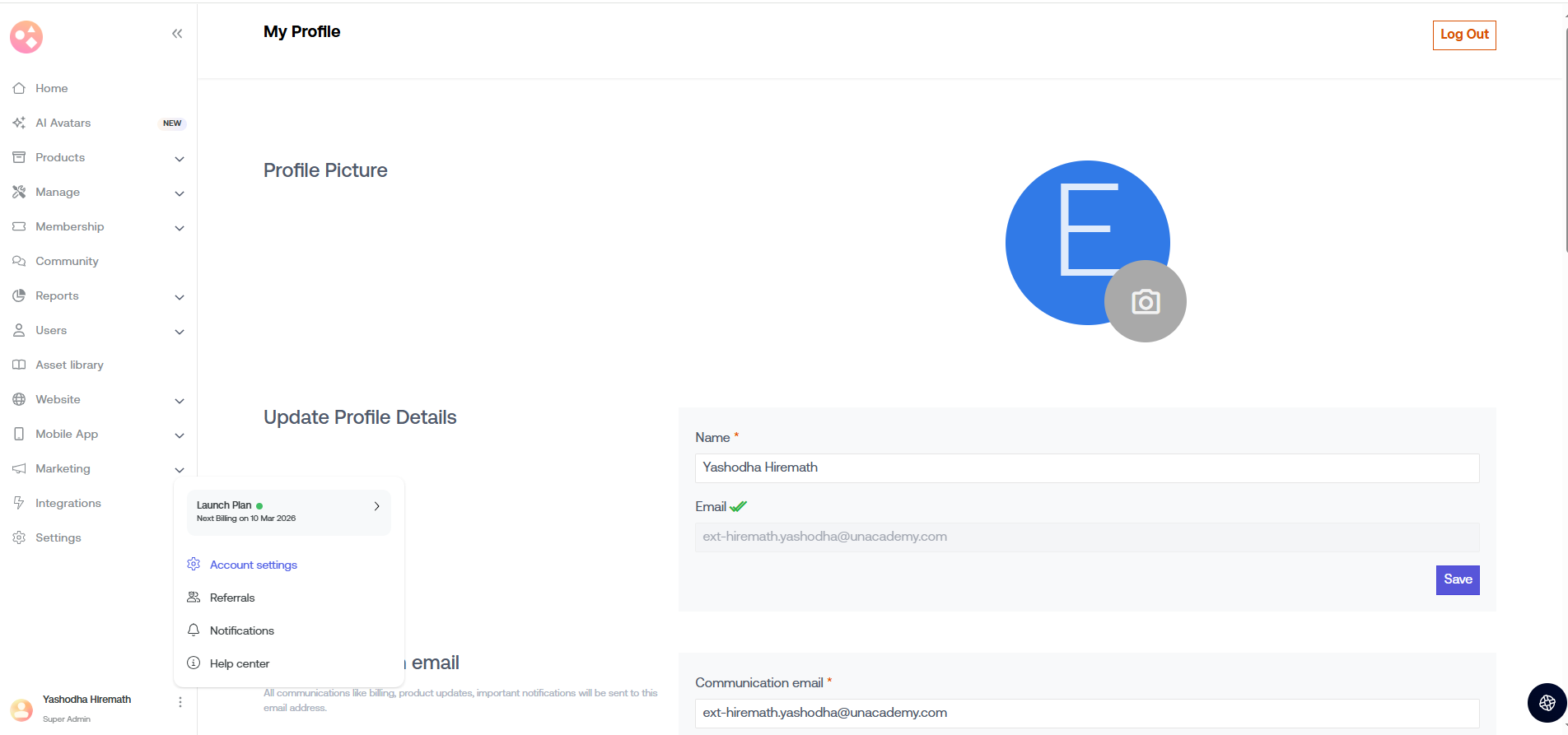 Select Account settings to update profile details, billing details, communication email, change password, language, and account deletion.