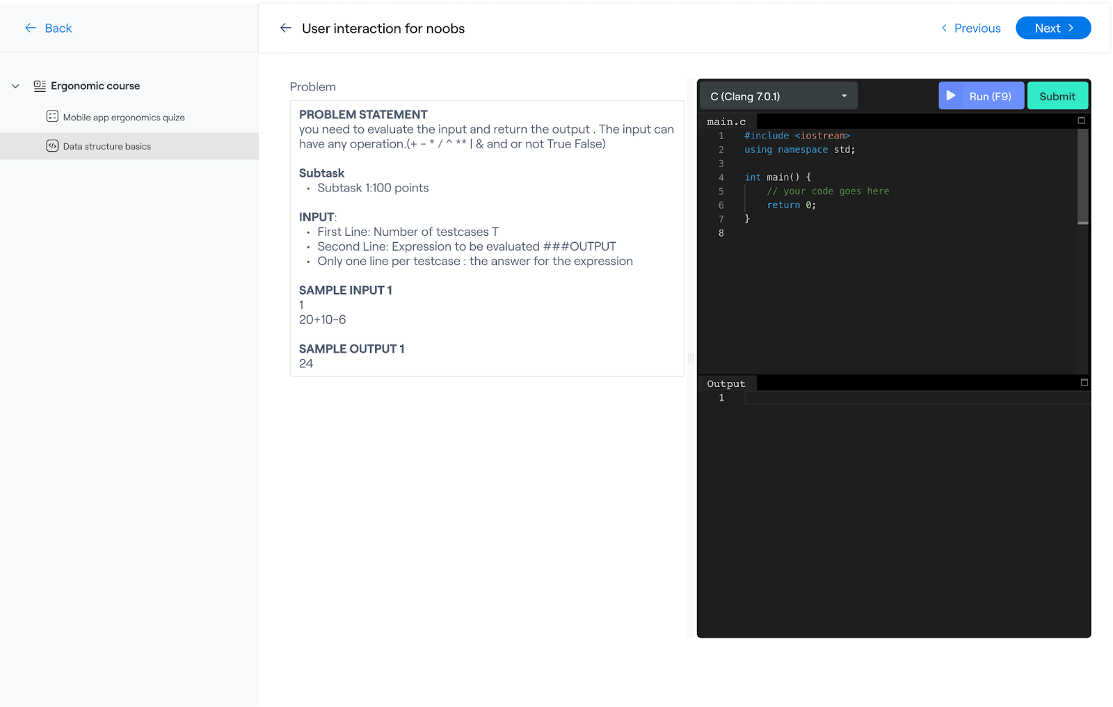 5. Attempting the Coding Test: Learners will be able to attempt the assignment in a compiler as show below. Currently, we support the following languages: Assembly (NASM 2.14.02), Bash (5.0.0), Basic (FBC 1.07.1), C (Clang 7.0.1), C (GCC 7.4.0), C (GCC 8.3.0), C (GCC 9.2.0), C++ (Clang 7.0.1), C++ (GCC 7.4.0), C++ (GCC 8.3.0), C++ (GCC 9.2.0), C3 (latest), Clojure (1.10.1), COBOL (GnuCOBOL 2.2), Common Lisp (SBCL 2.0.0), D (DMD 2.089.1), Elixir (1.9.4), Erlang (OTP 22.2), Executable, Fortran (GFortran 9.2.0), Go (1.13.5), Groovy (3.0.3), Haskell (GHC 8.8.1), Java (OpenJDK 13.0.1) and JavaScript (Node.js 12.14.0), Python (2.1.17, 3.8.1)