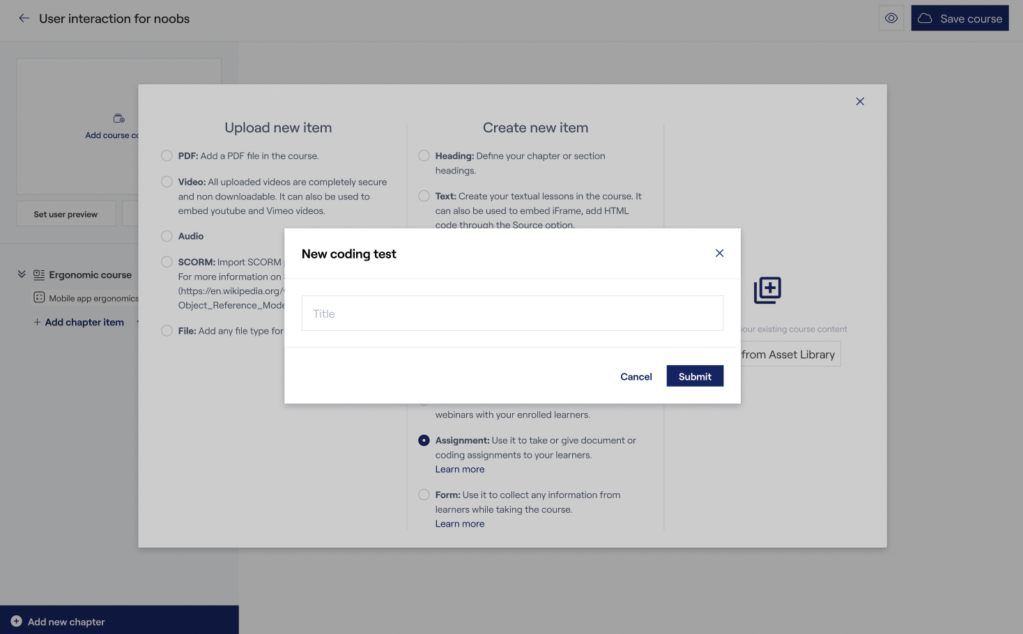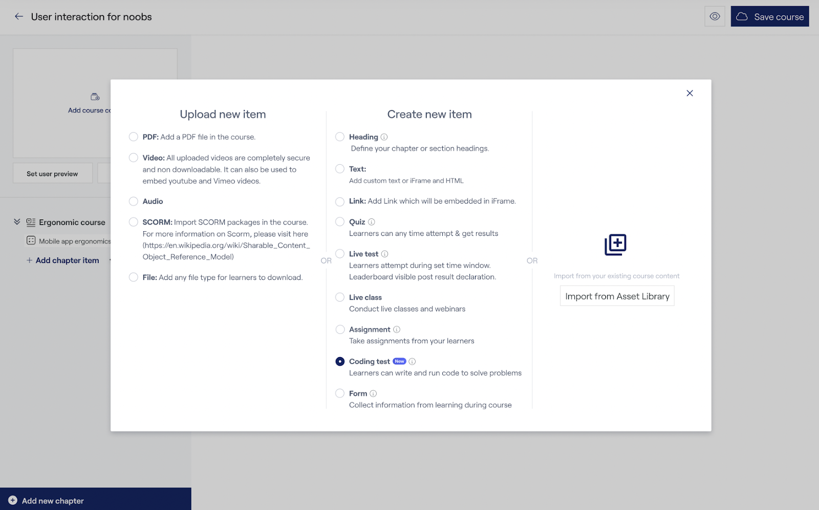 2. Selecting Coding Test: Choose "Coding Test" as the type of item you want to create from under "Create new item".