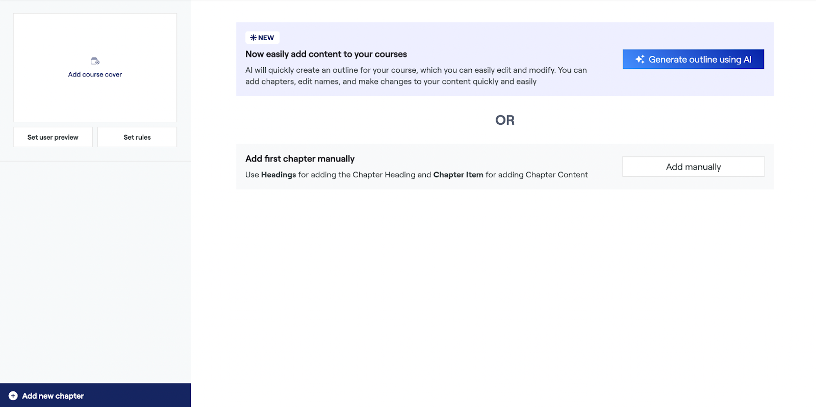 - On the Course Builder landing page, click on "Add First Chapter Manually" or "Add New Chapter" from the bottom-left corner.