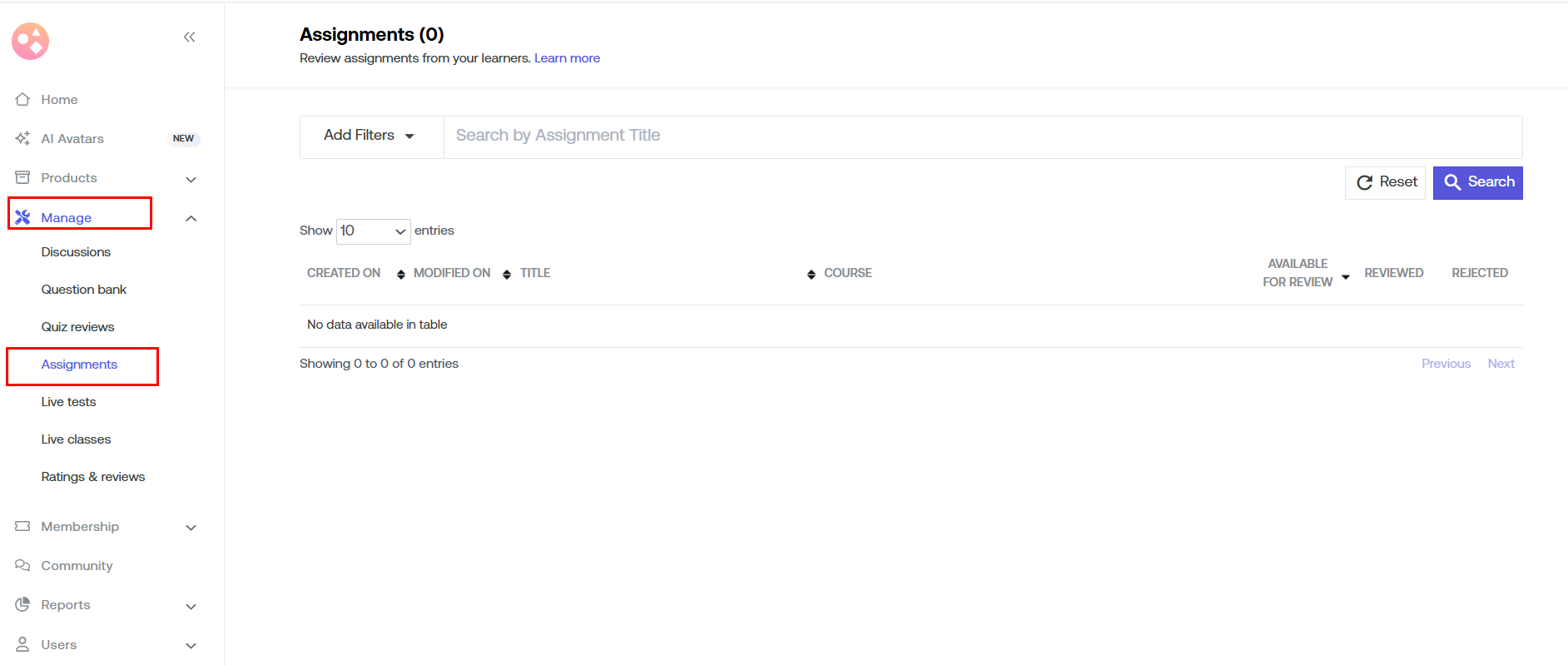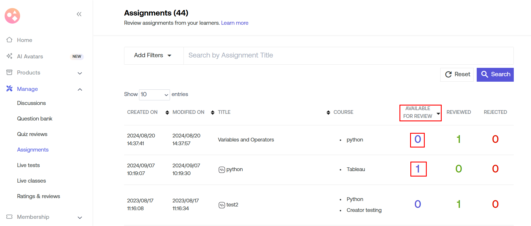 - Available for Review- It indicates the number of assignments that are ready for review. Once the learner submits an assignment, it automatically goes into available for review.
