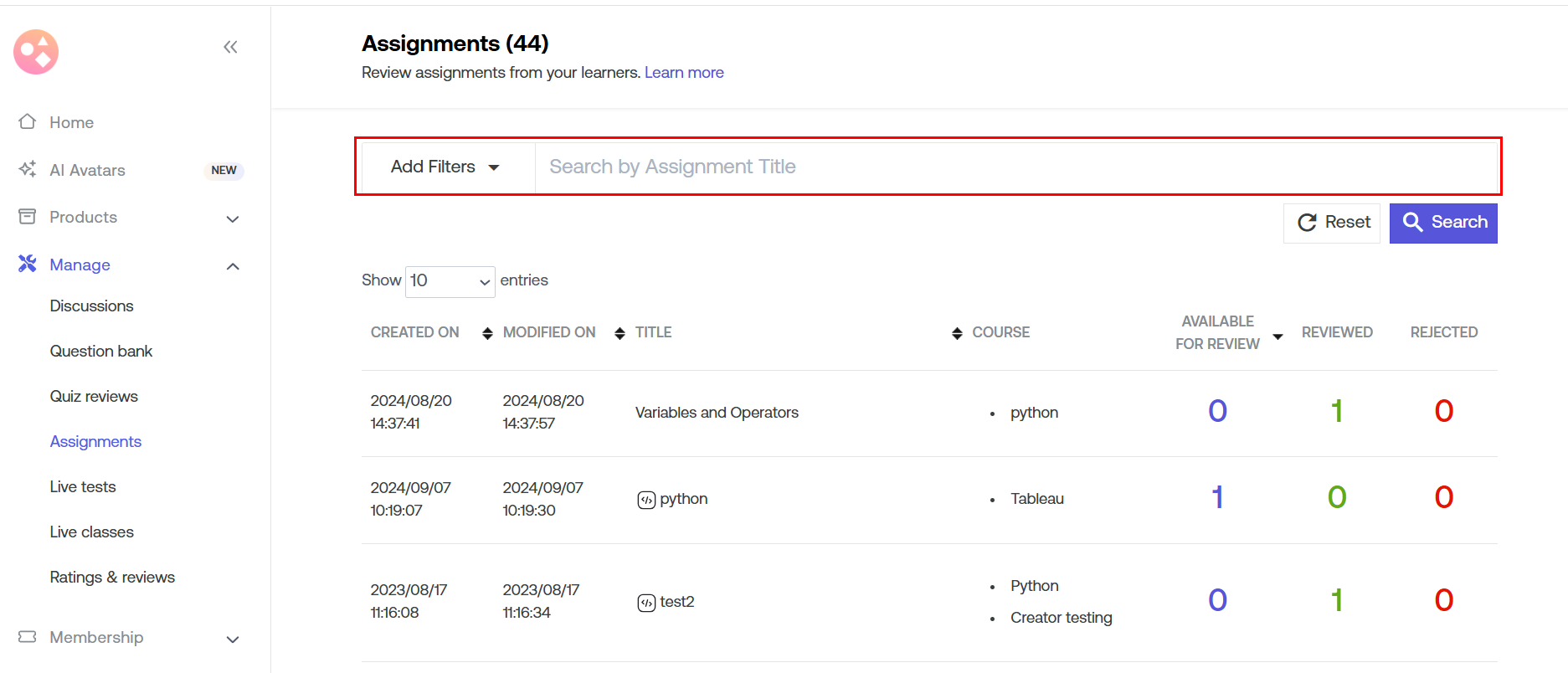 - Reviewed: Placed just beside the individual assignments, there are respective numbers given under "Reviewed". These numbers show the number of learners whose assignments have already been reviewed. If you wish to change the action taken on that particular assignment, you can do it under "Actions".