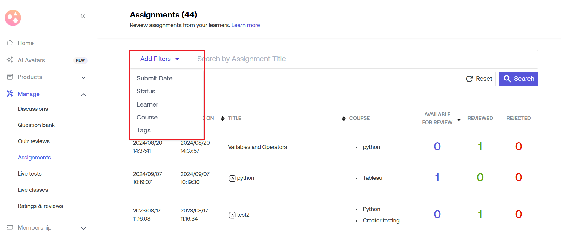 There's also an option to filter by learners, courses, submission date, status, and tags. Then click on search to view the results.