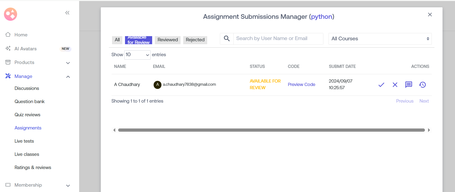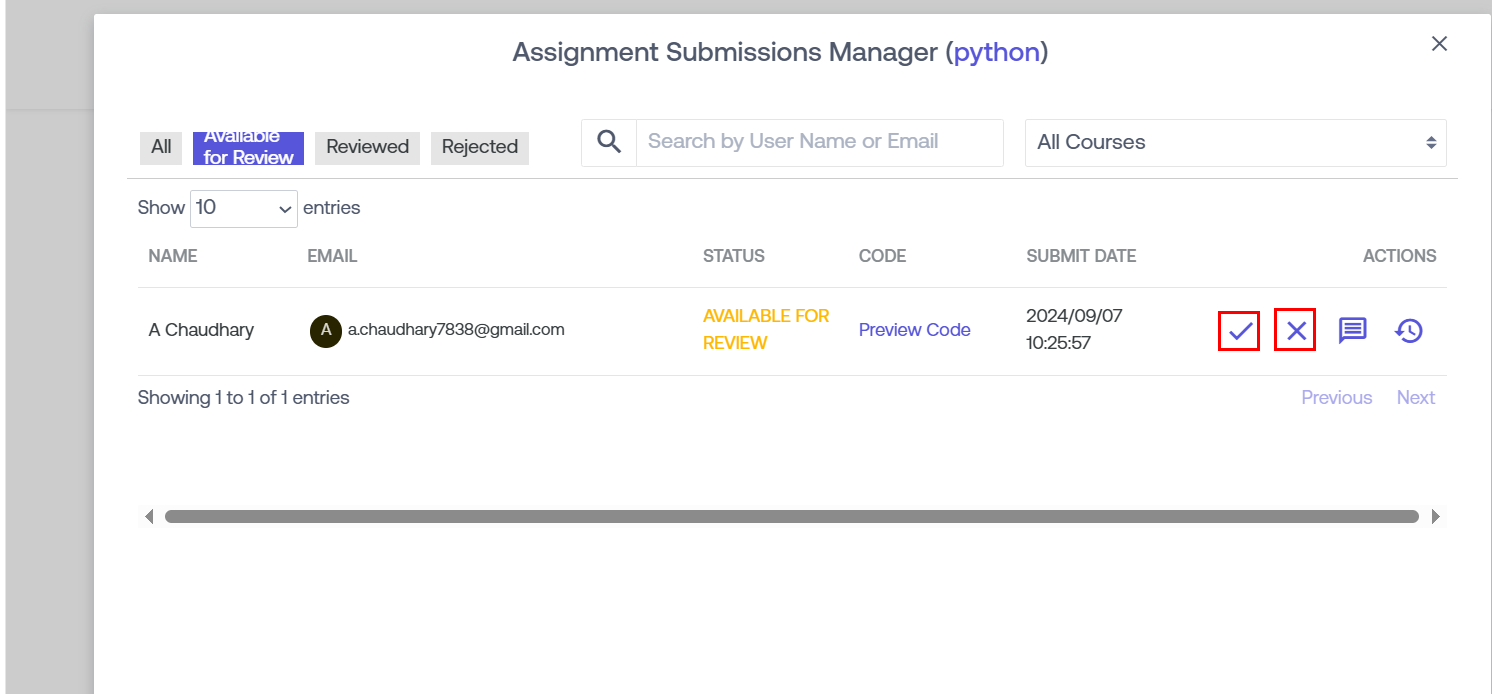 Rejected: Placed just beside the individual assignments, there are respective numbers given under "Rejected". These numbers show the number of learners whose assignments have already been reviewed and rejected. If you wish to change the action taken on that particular assignment or approve them after rejecting, you can do it under "Actions".