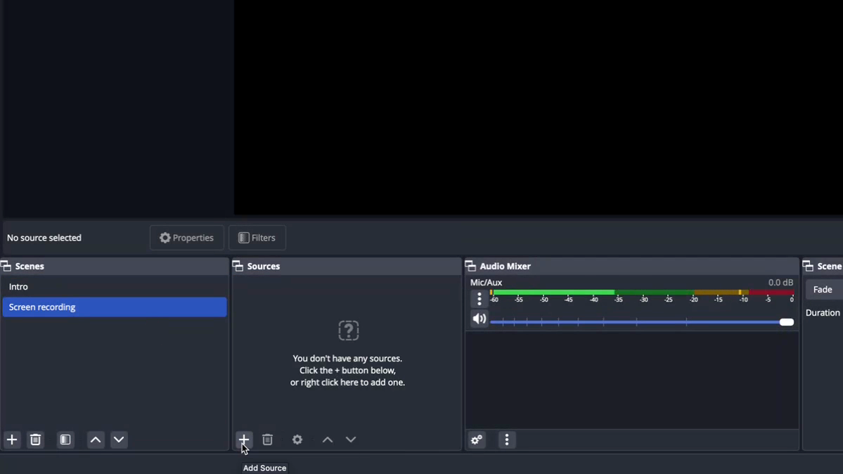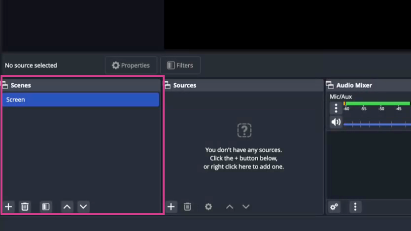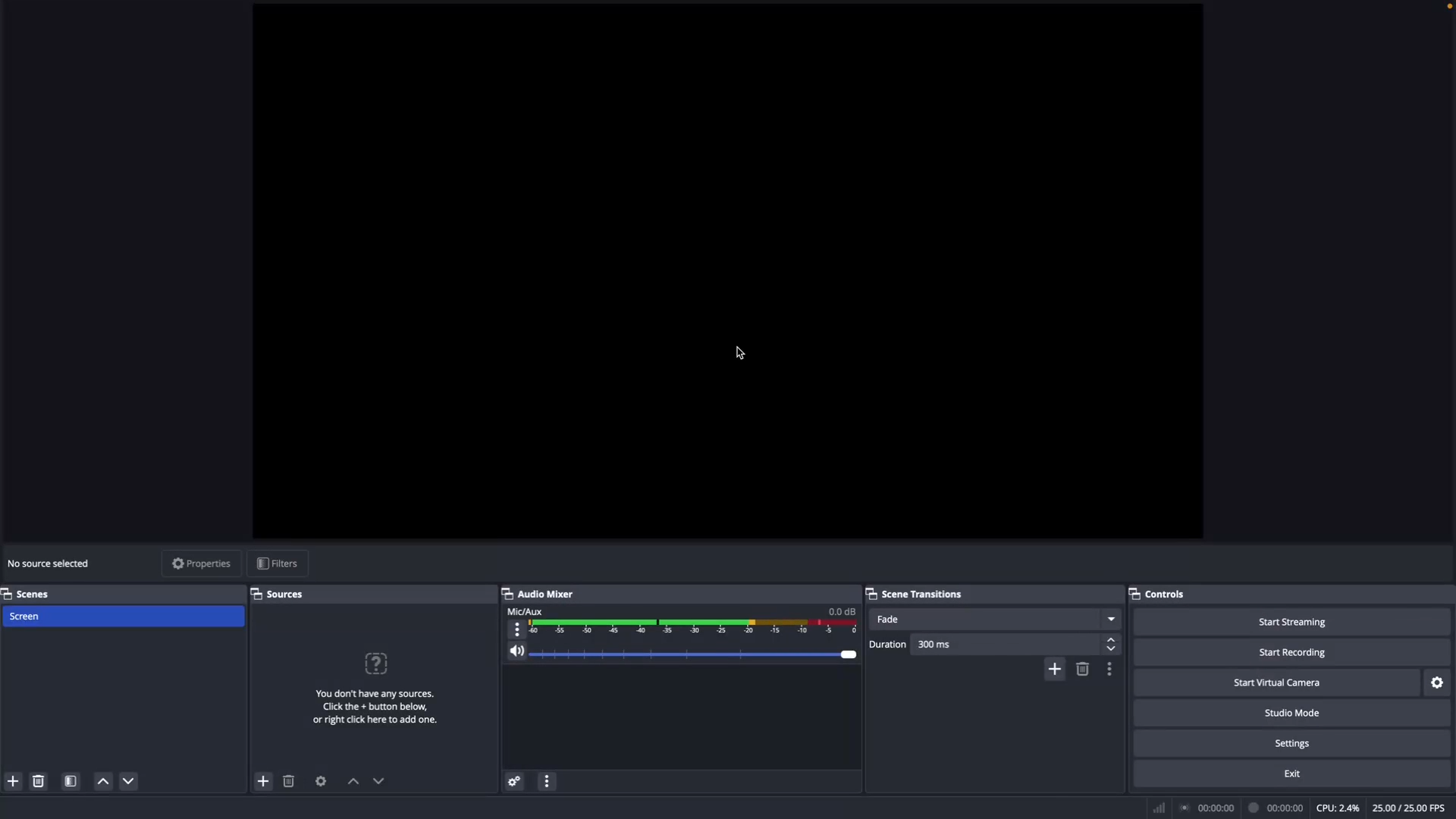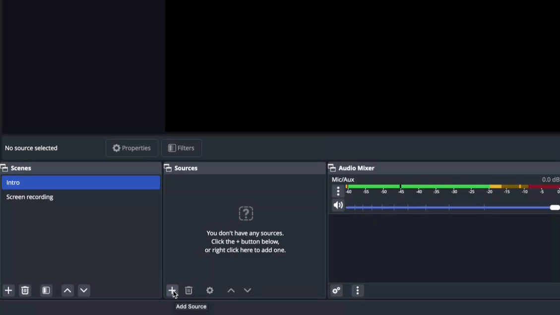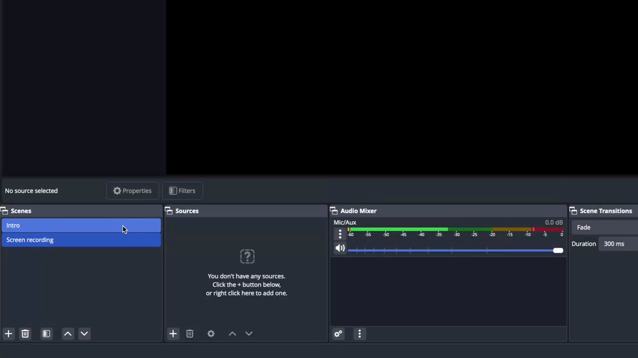 Step 3: Familiarize yourself with the OBS home screen. The black area at the top is the preview section.