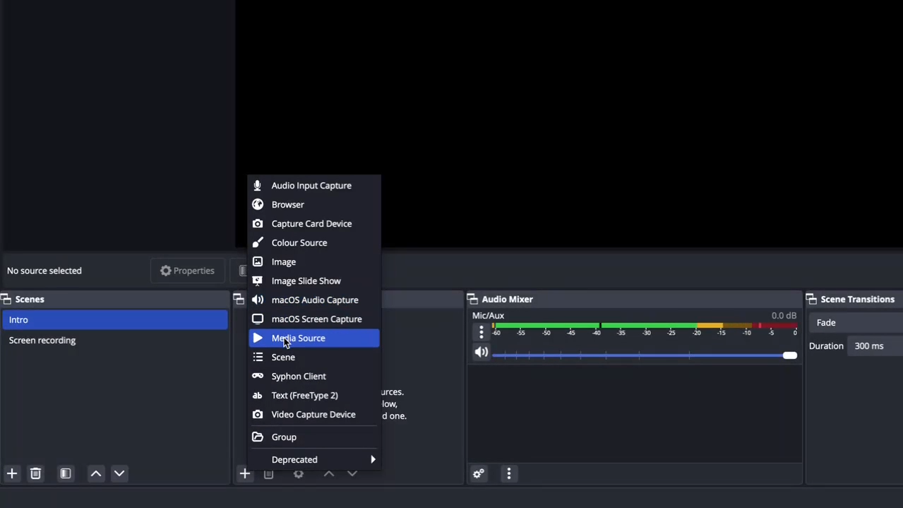 Step 7: To add new sources, select "screen recording" and click on the plus icon. If using a Mac device, select "macOS screen capture".