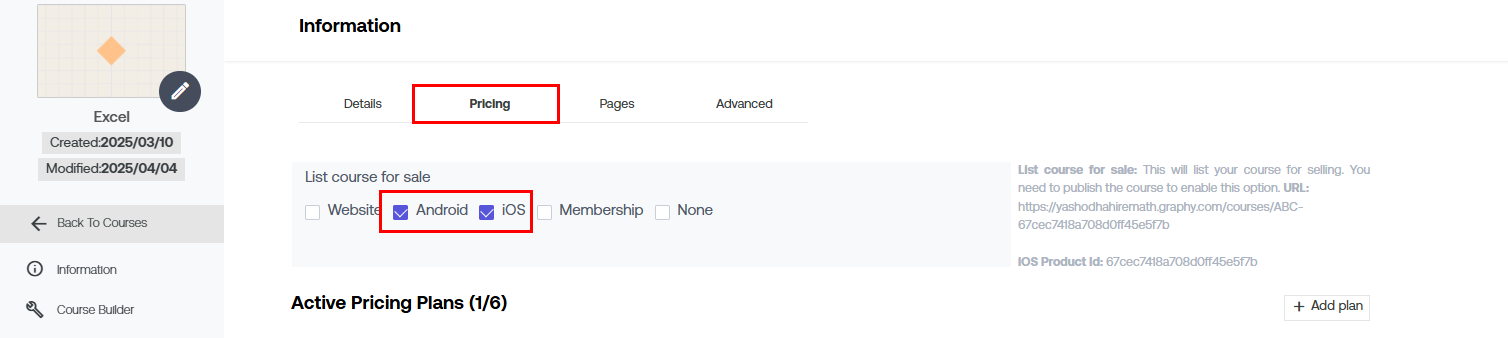To make sure your course is visible on your apps as well, check the checkbox Android and iOS individually.