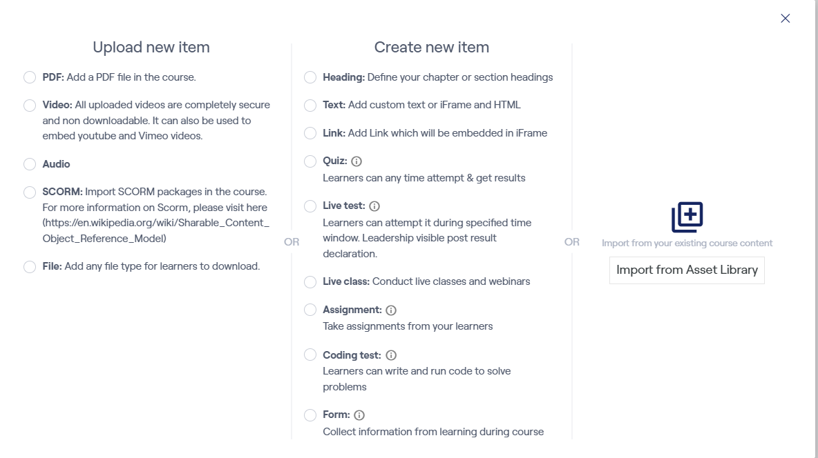 A Quiz is usually a short test. It is an interesting and engaging way for learners to better understand the nuances of the course. Learners can attempt it at any time and view instant results.