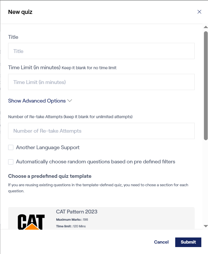 No. of Re-takes Attempt- You can give liberty to the learners to attempt a quiz multiple times. Just select the number of times you want to allow them to attempt the quiz. You can leave this space blank if you don't want to restrict the number of times they appear.