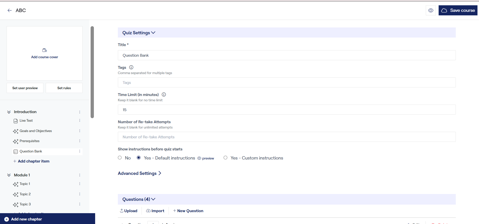Log in to the platform and click on the Courses available in the left navigation. Now click on the Course tab. Open your course in Course Builder and click on create a new item, then select "Quiz". Now enter the title, time limit & no of attempts allowed to get started.