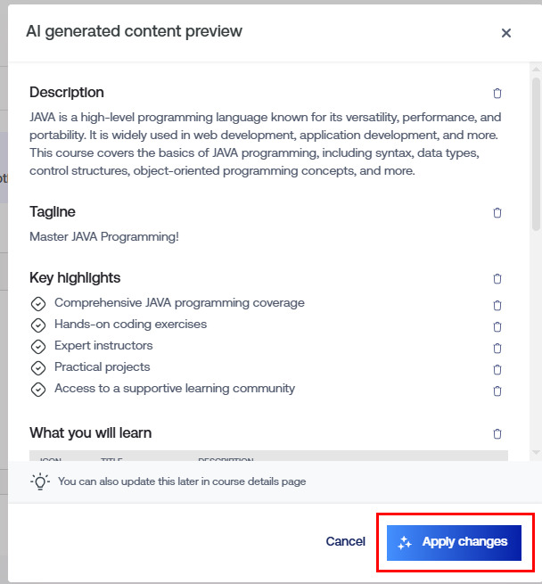 Use the AI feature to create an outline for your course quickly. You can easily edit and modify this outline by adding chapters, editing names, and making changes to your content.