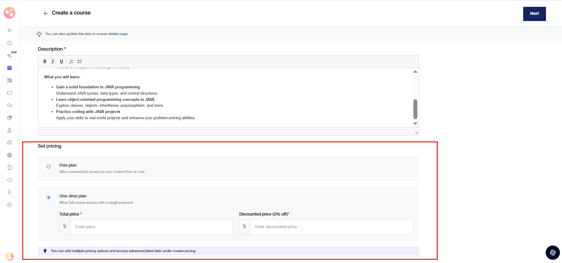 Step 6: Scroll down to add the price of the course and the discounted price. You can make it free by switching off the toggle button.