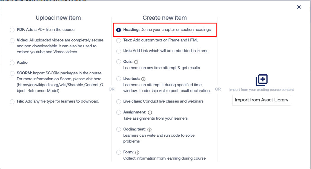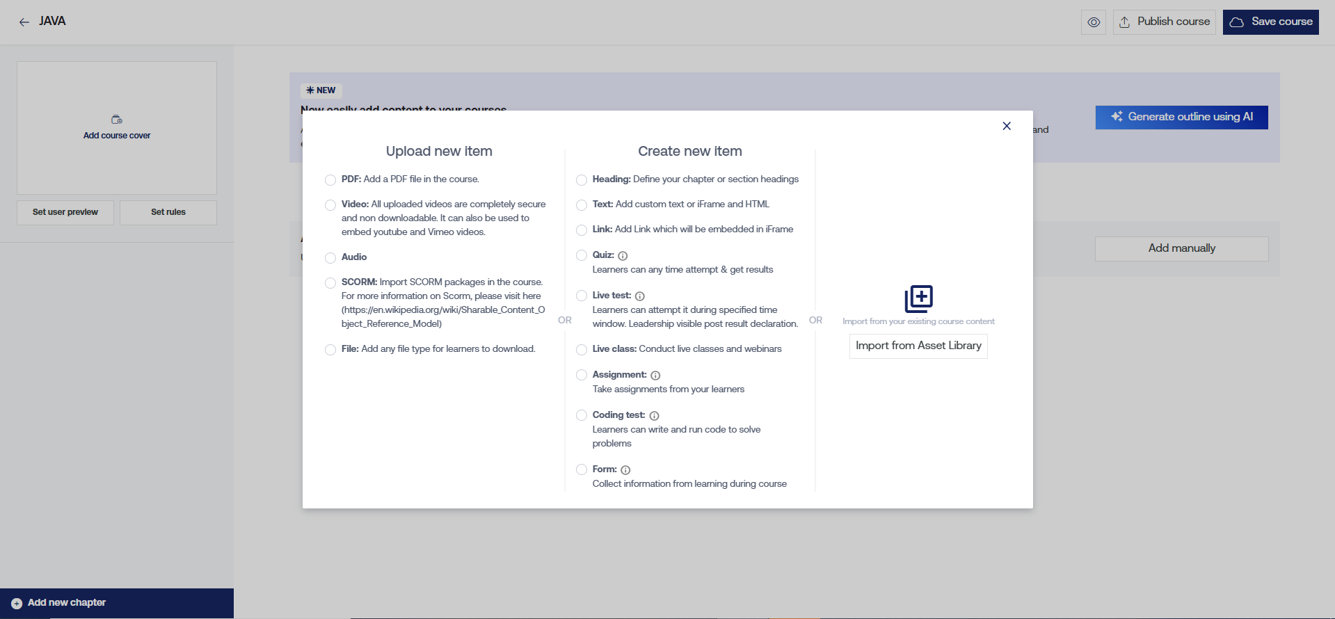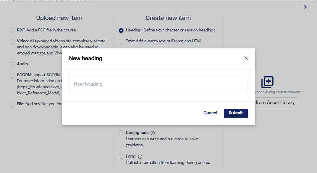 - Upload New: The "Upload New Item" feature allows you to add diverse content to your course: PDF, Video, Audio, SCORM, and File.