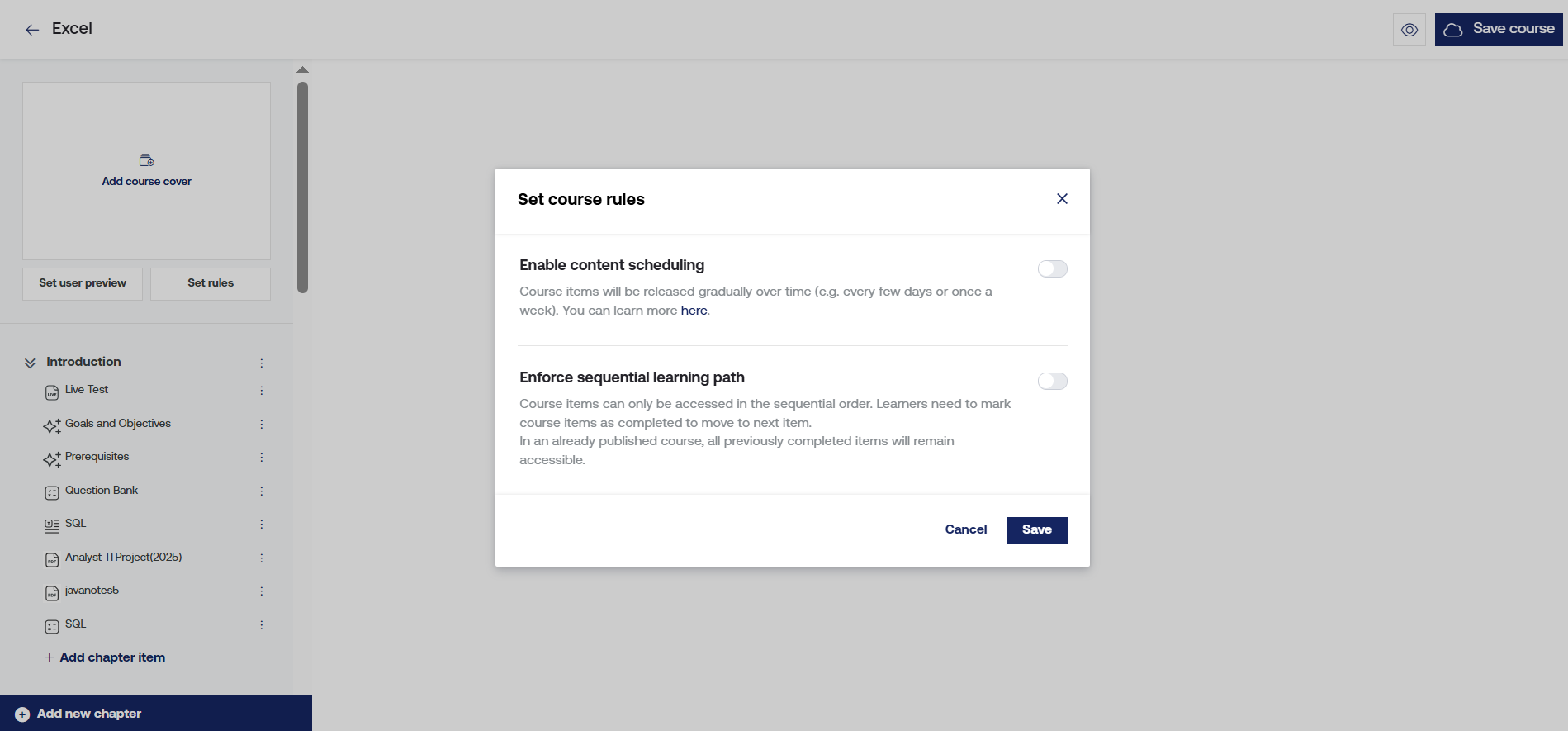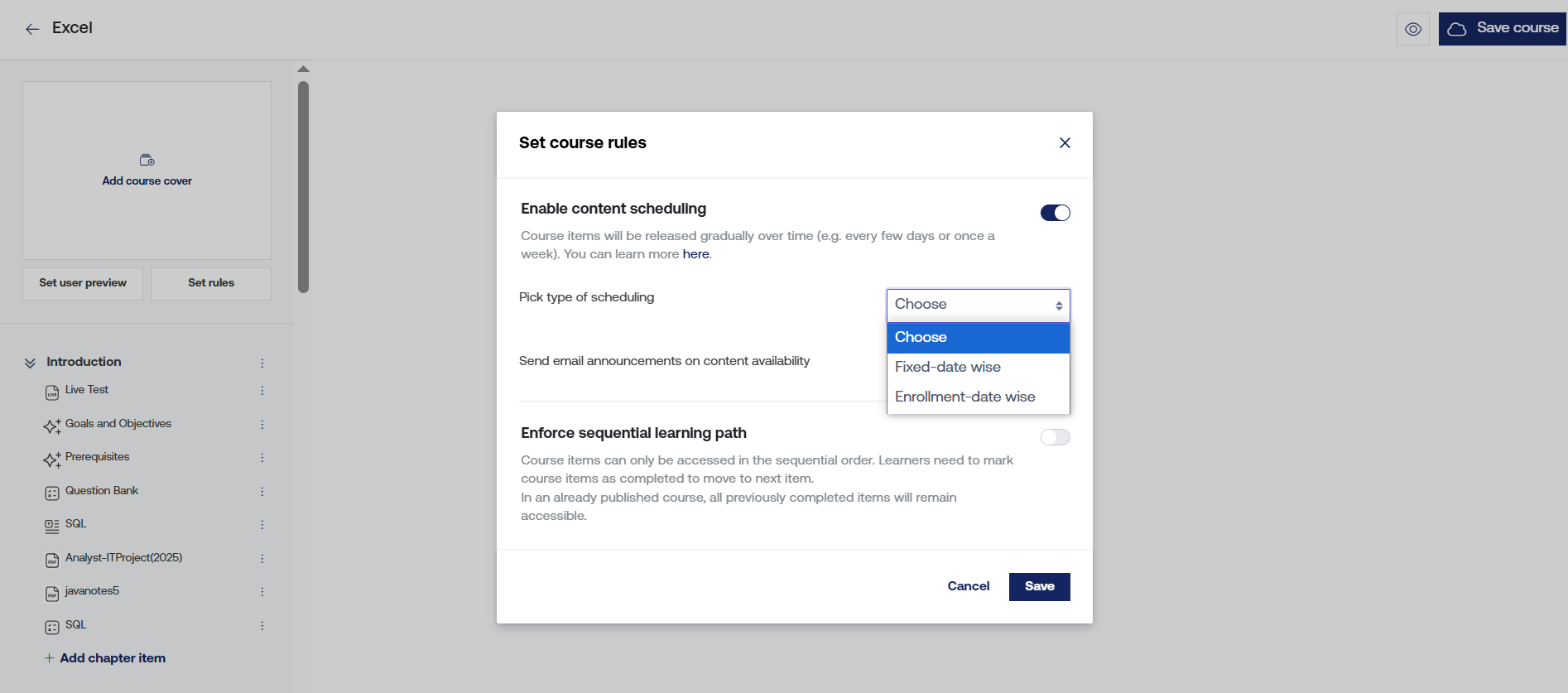 - Click on it and set the date when the chapter will be available from the enrollment date.