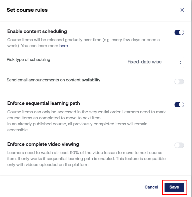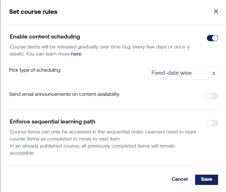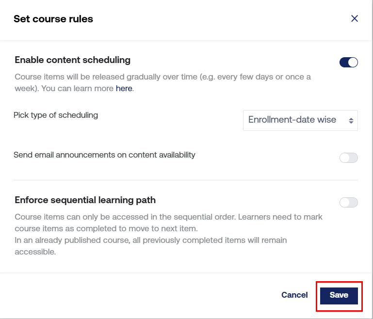 Content Scheduling, which is also called Content Dripping is a way to release your course material at different intervals rather than releasing them all at once. If you want a particular chapter or multiple chapters to release on a fixed date, or after a certain period, you can use the feature "enable content scheduling".