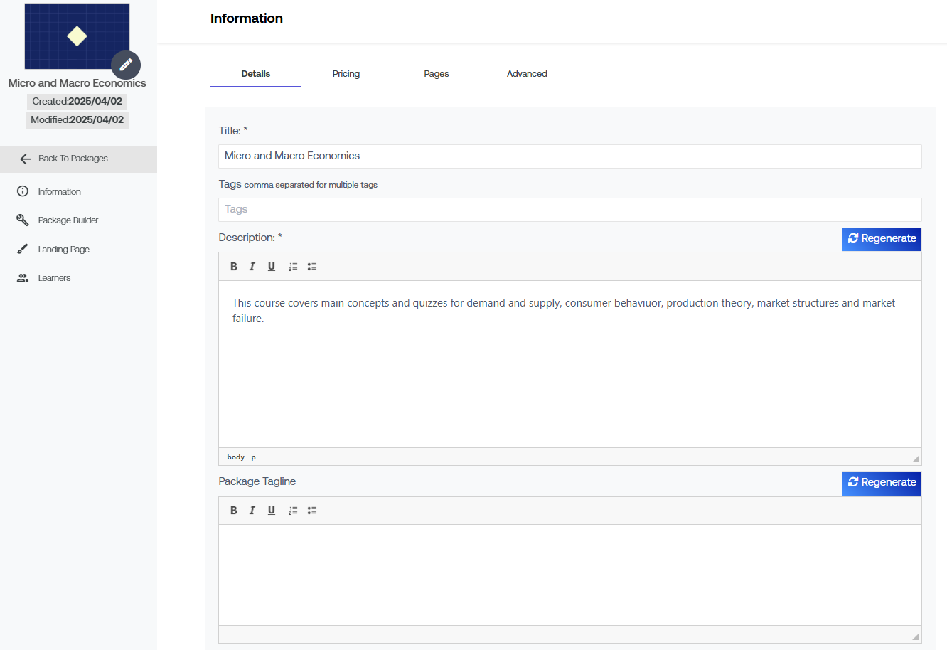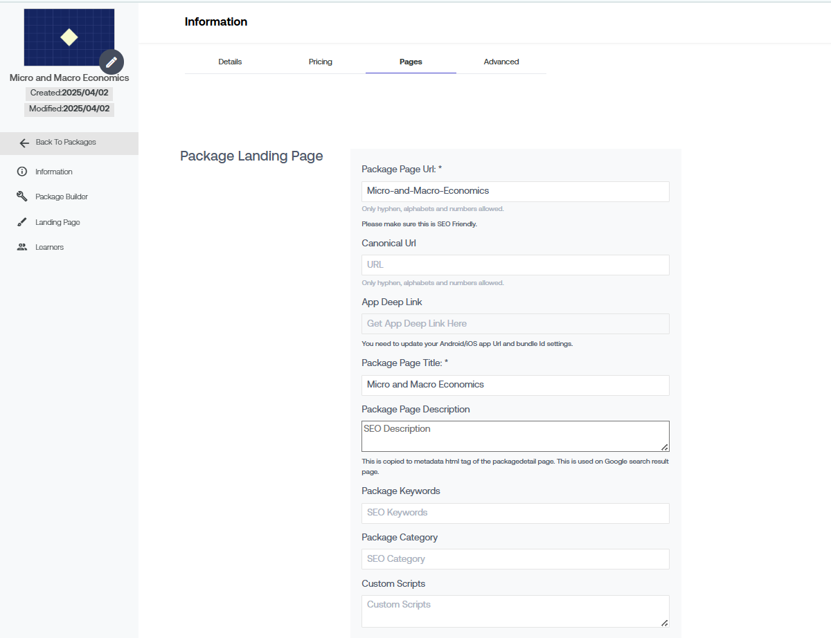 This page contains the basic details of the package which would be visible to the learners in the Website/App store.