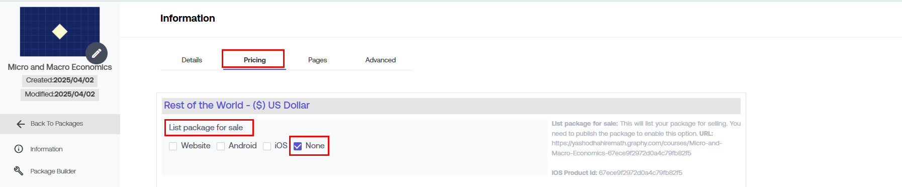 Now click on the "INFORMATION" towards the left. Select the "Pricing" option placed on the top. Under "Pricing", go to "List package for sale".
