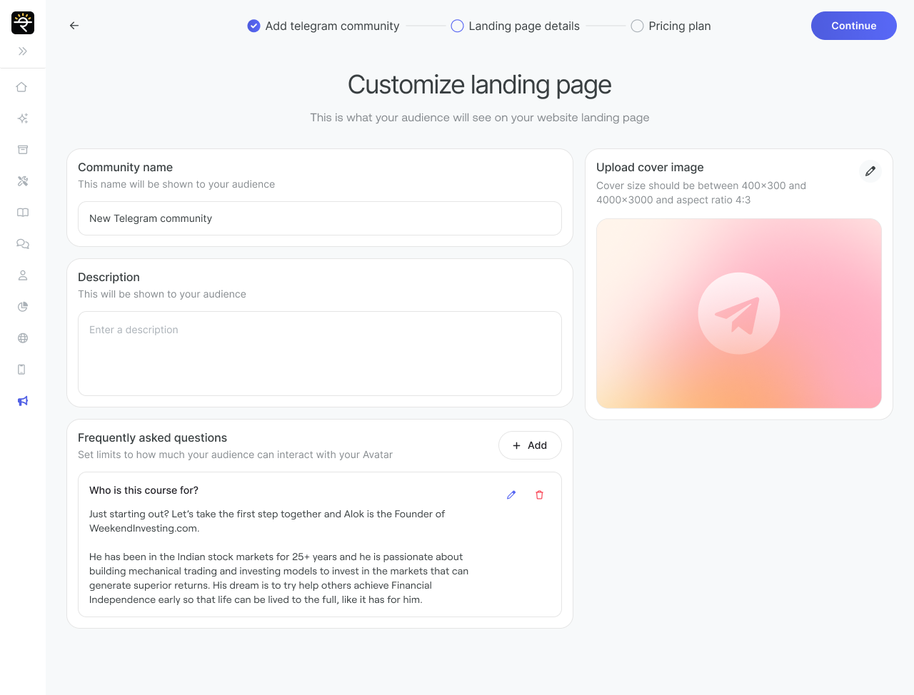 Frequently asked questions: Set limits to how much your audience can interact with your Avatar. Click "+ Add" to enter a new question and answer. You can add multiple FAQs to help your audience understand more about the community.