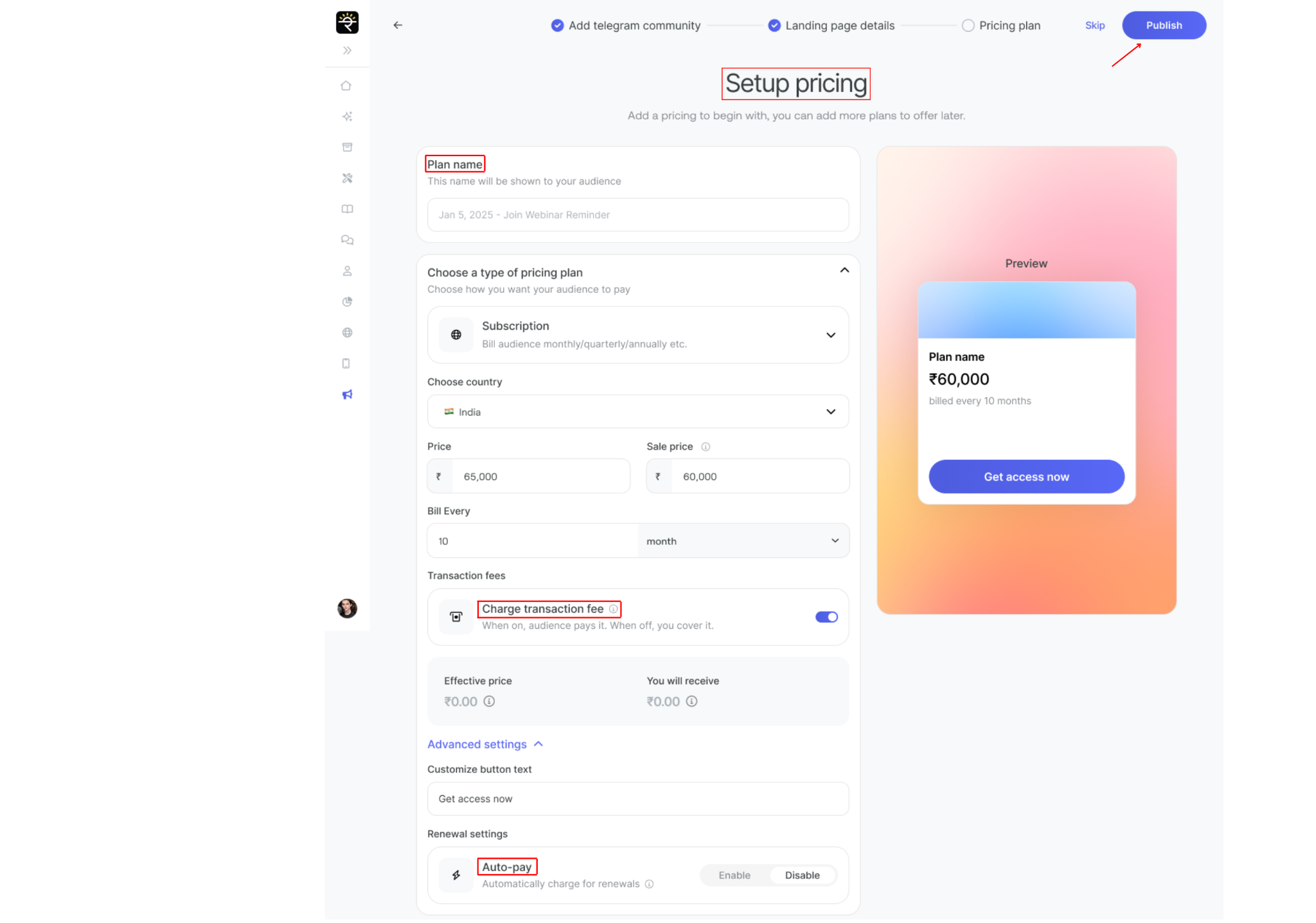Now you will configure the pricing for your Telegram community.