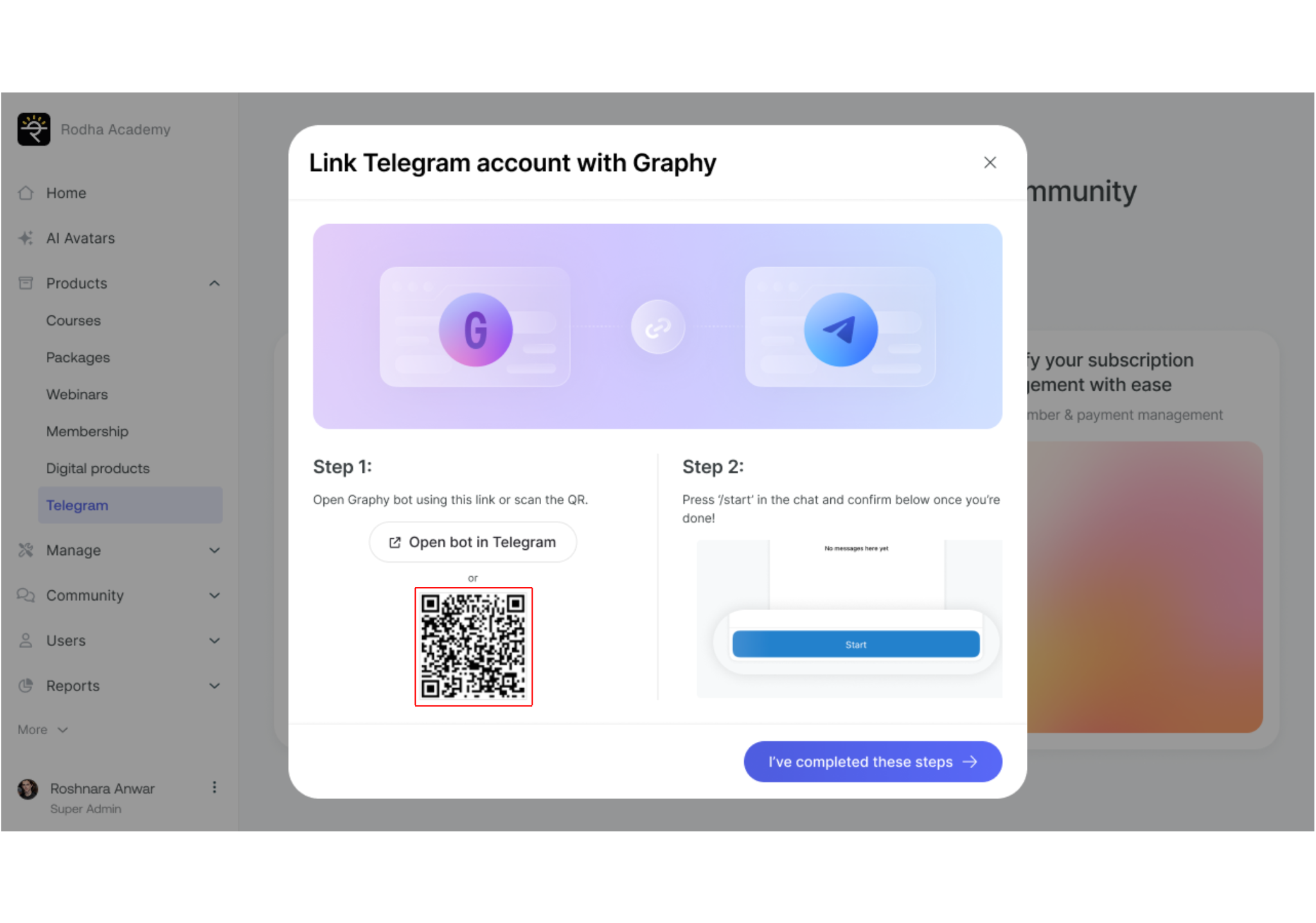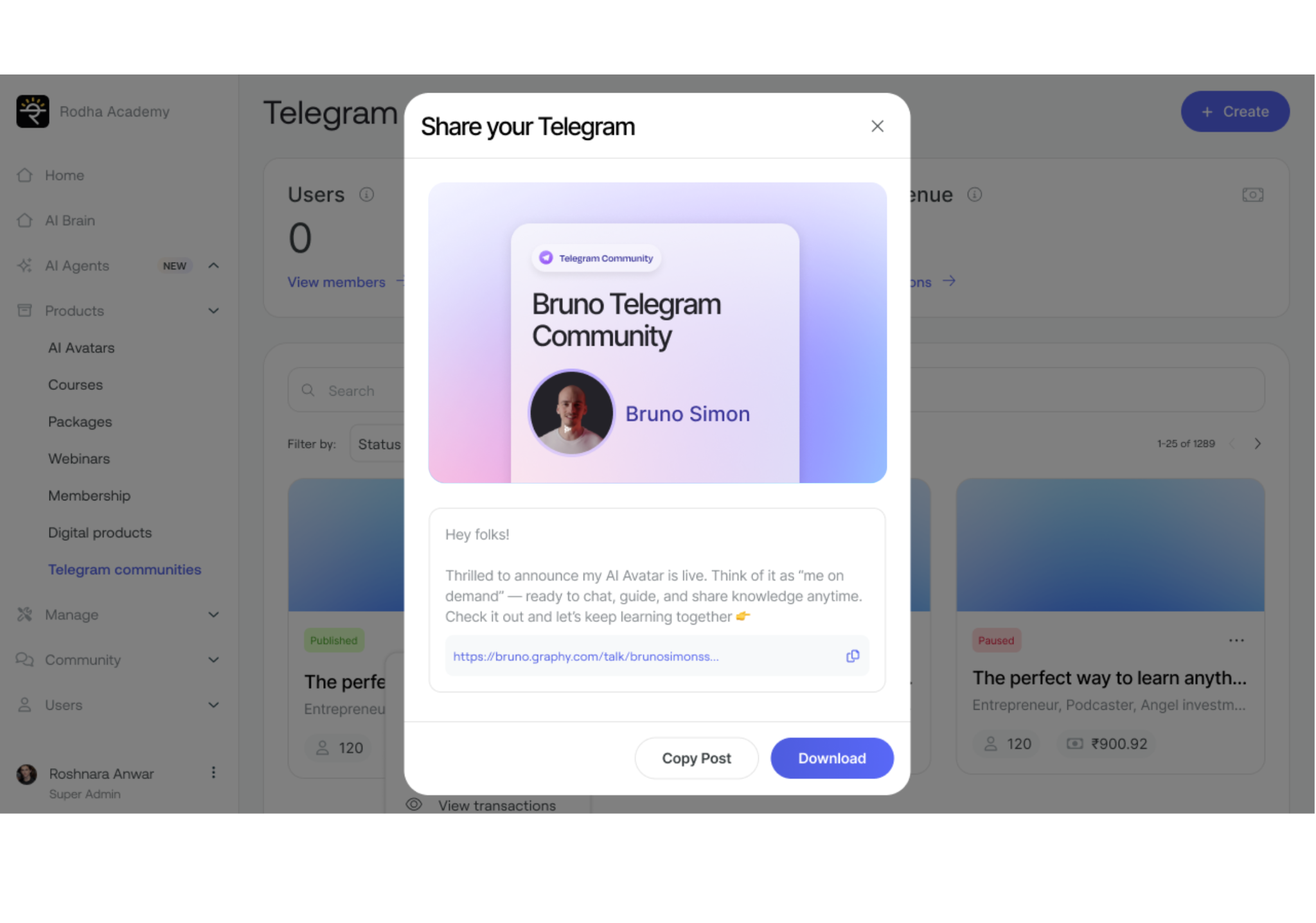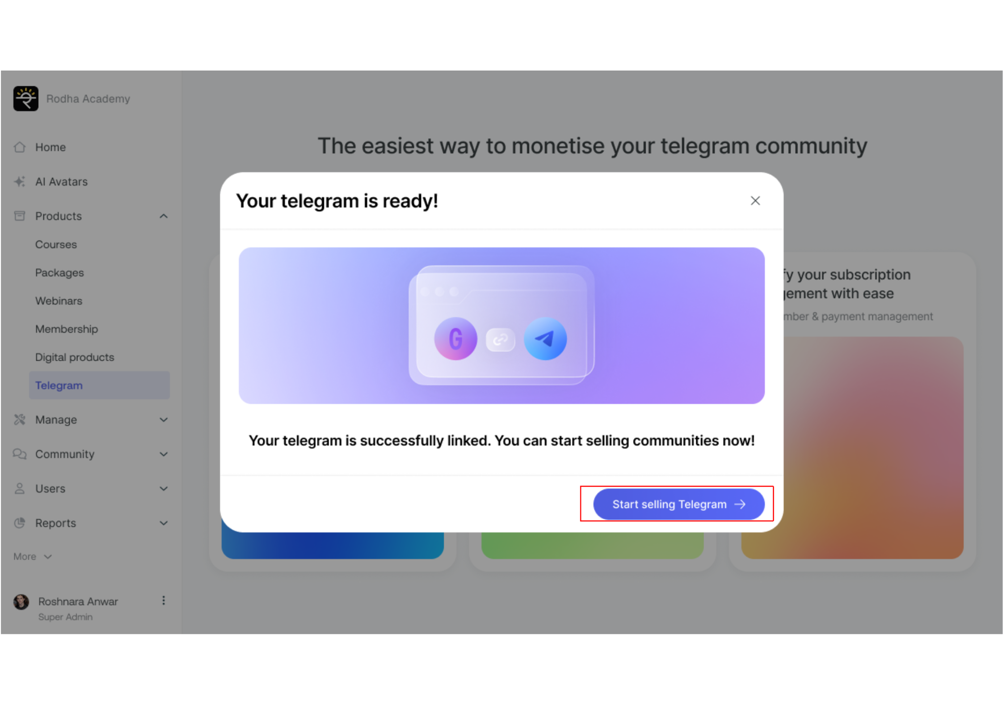 Congratulations! Your Telegram community is now live. A popup will appear allowing you to share it with your audience.