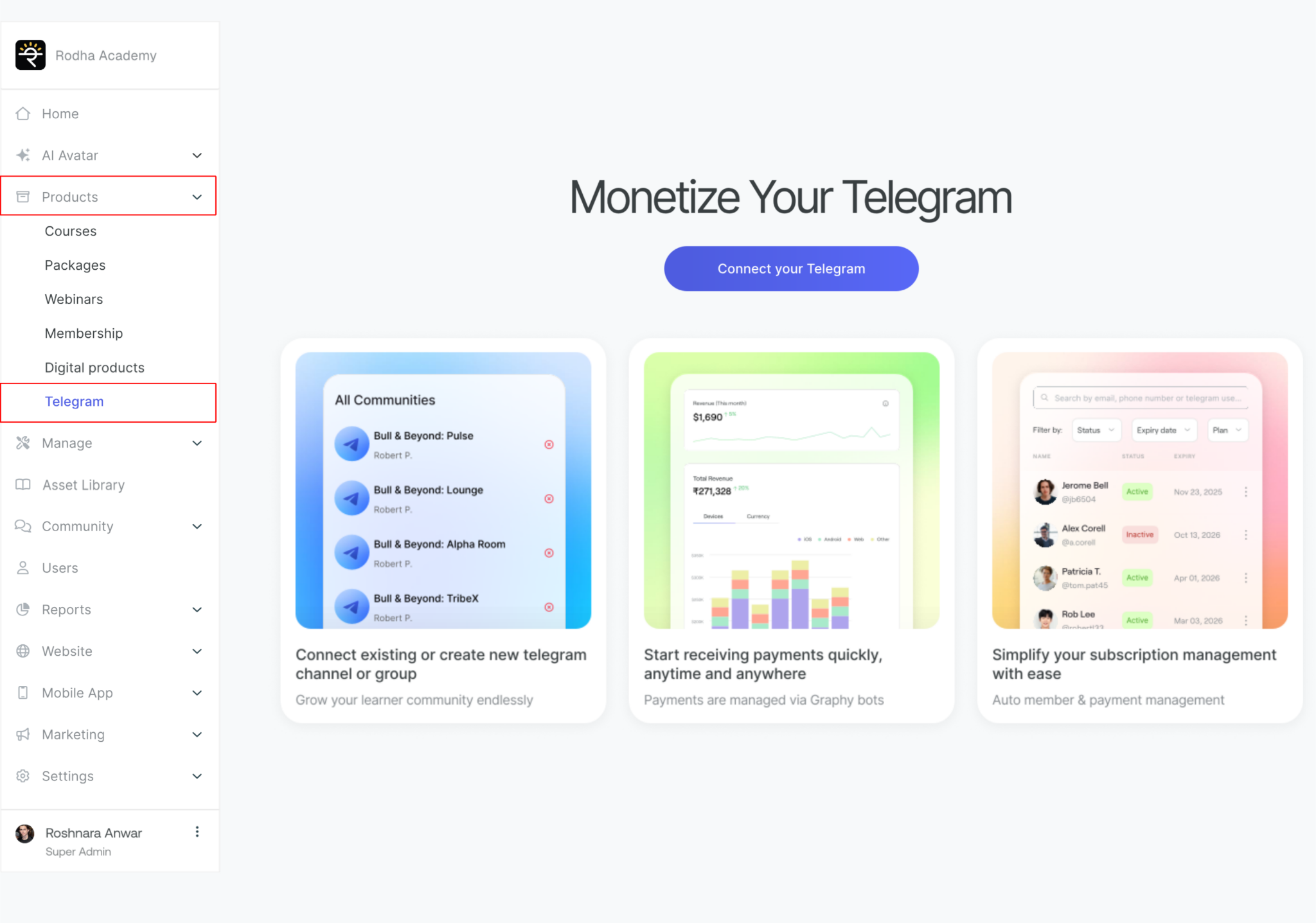 Go to Seekhly Dashboard > Left Navigation Panel > Products > Telegram communities.