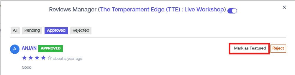 Once you have approved a review, you can feature them on top. Click on "Mark featured" to place that review on top of all the other reviews.