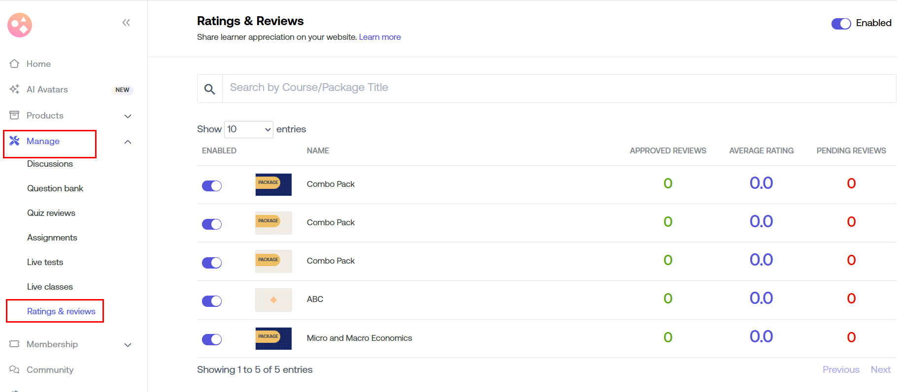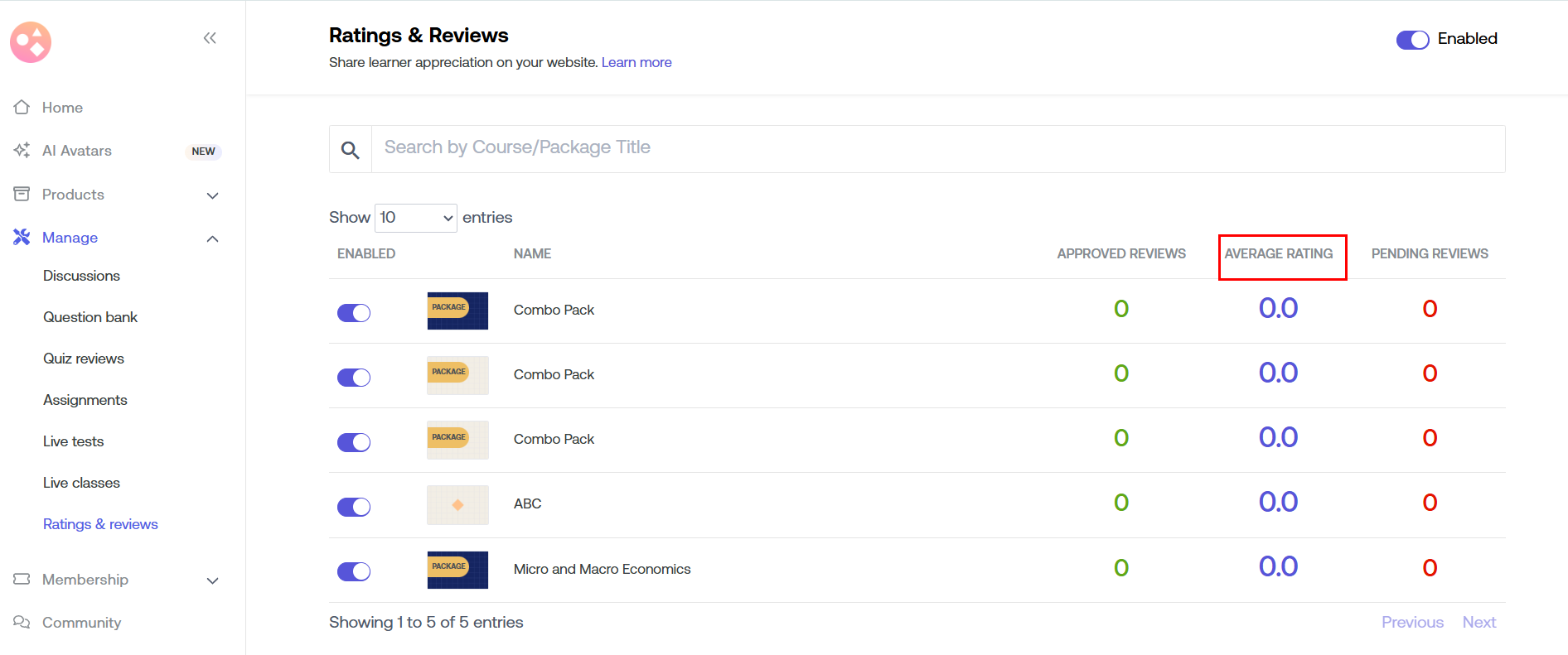 The learners have the option to rate the courses along with submitting a review. 5 being the highest rating & 1 being the lowest. Average Rating is automatically calculated by taking into account all the Ratings & Reviews that you have approved.