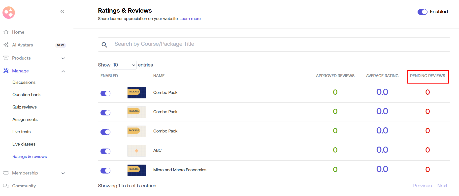 This article describes how to view & approve Pending Reviews and check average Ratings within the course platform.