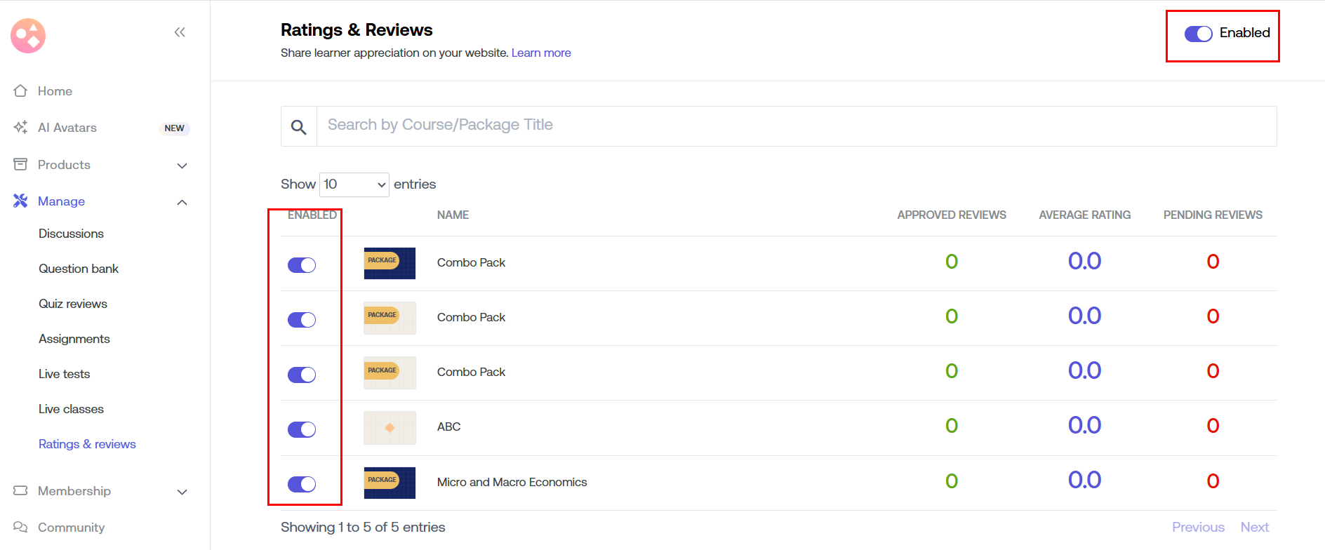 Reviews & Ratings are by default enabled in your course platform. However, you have a choice to disable it for your platform or your chosen courses.