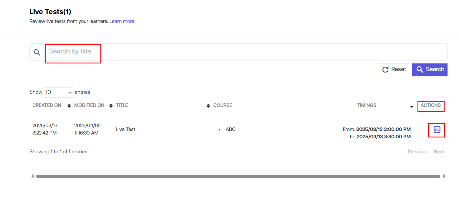 Live Tests assess learners' abilities within a fixed time frame, with results generated manually or automatically, and display a Leadership Board to learners after results are declared.