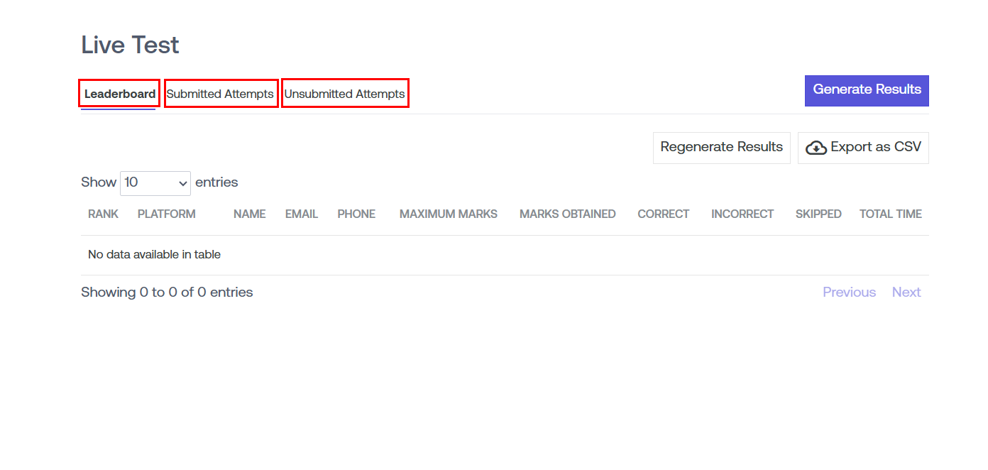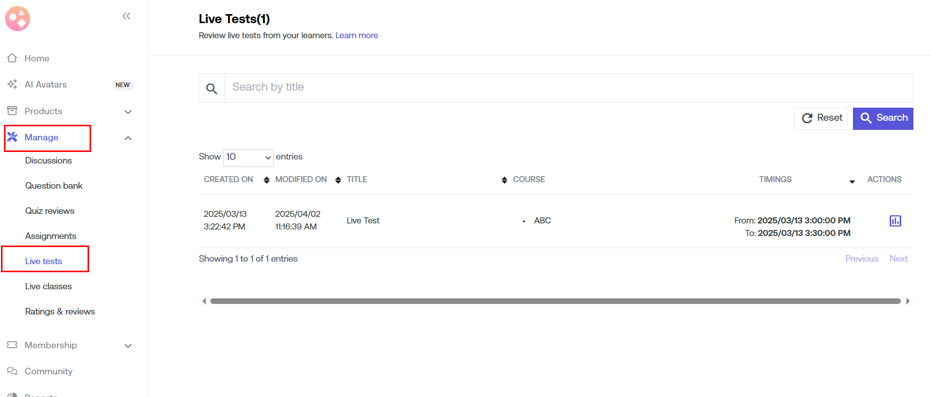 Go to Seekhly Dashboard > Left Navigation Panel > Manage> Live Test.