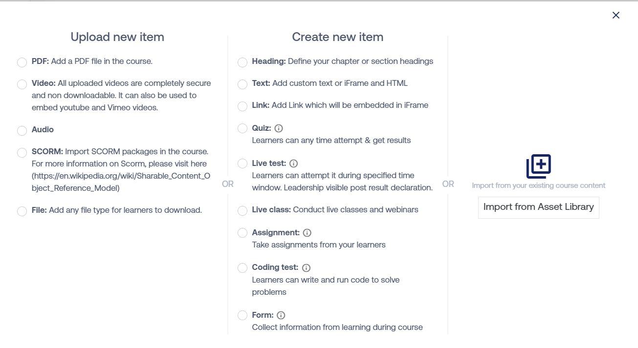 Now, select "Choose from Asset Library", to add "Live Class Recording" to your course content.