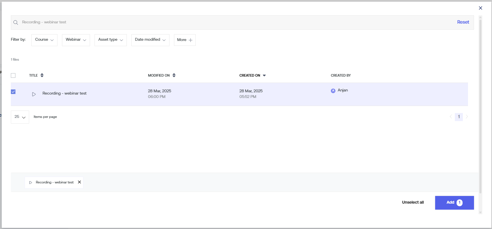 Please note that you can choose multiple recordings at once to add as course items.