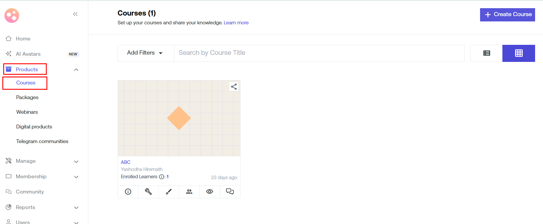 Now, click on the "Course Builder" icon of that course to add "Live Class Recording" as course content.