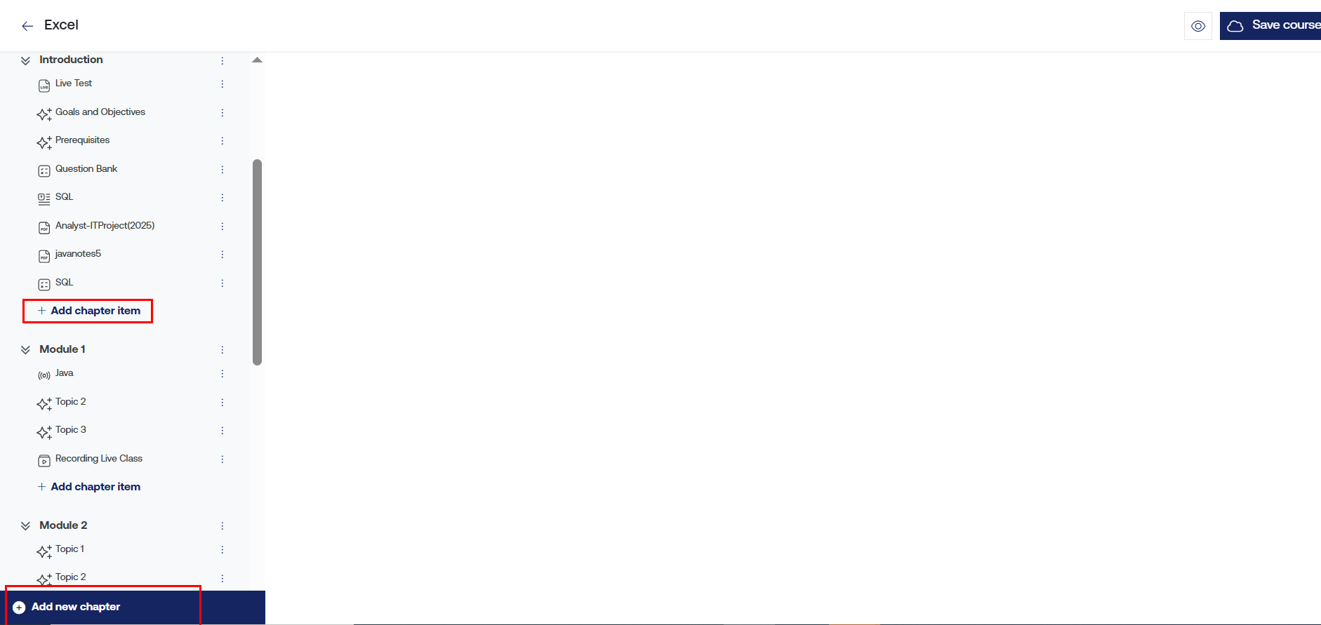 In the Course Builder tab, click on "Add New Chapter" to add a new chapter or "Add Chapter Item" to add a new sub-chapter.