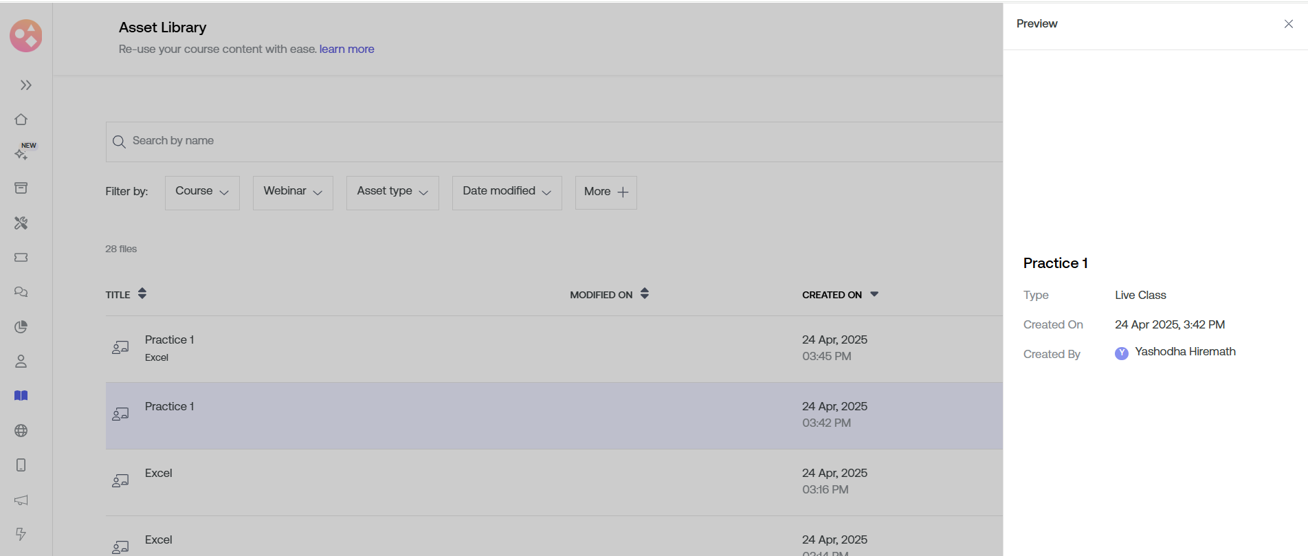 In the Asset Library, you can easily spot your Live Class Recording. If you haven't uploaded any new content after the Live Class ended, it will be on top. To view all your Live Class Recordings, go to "Add Filters" & select "Video Type".
