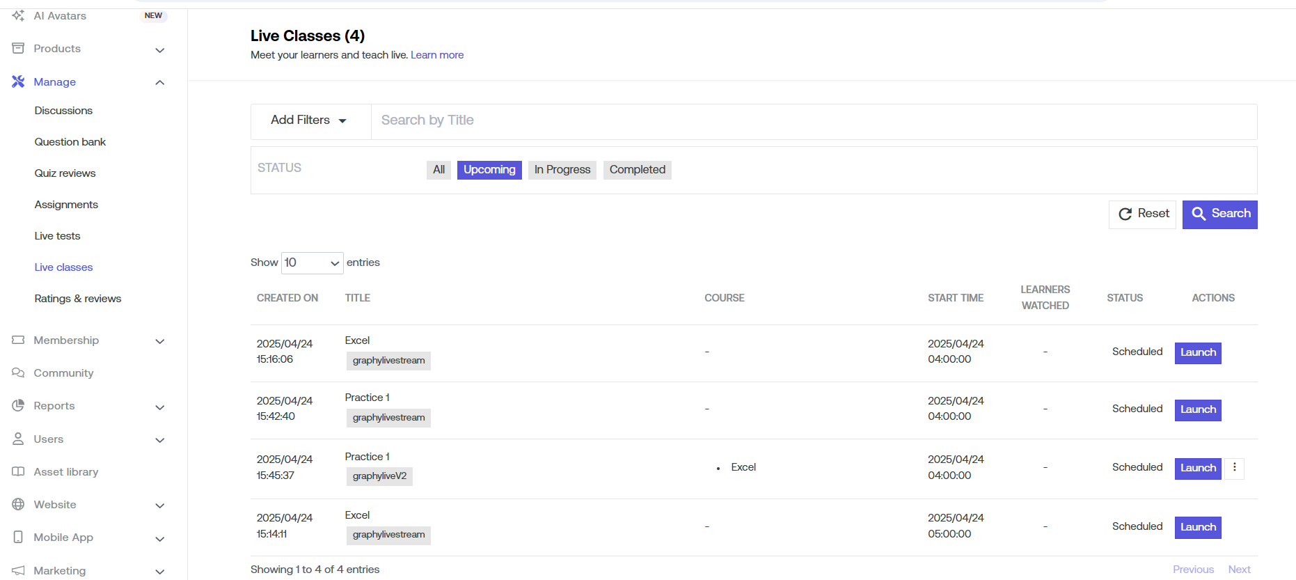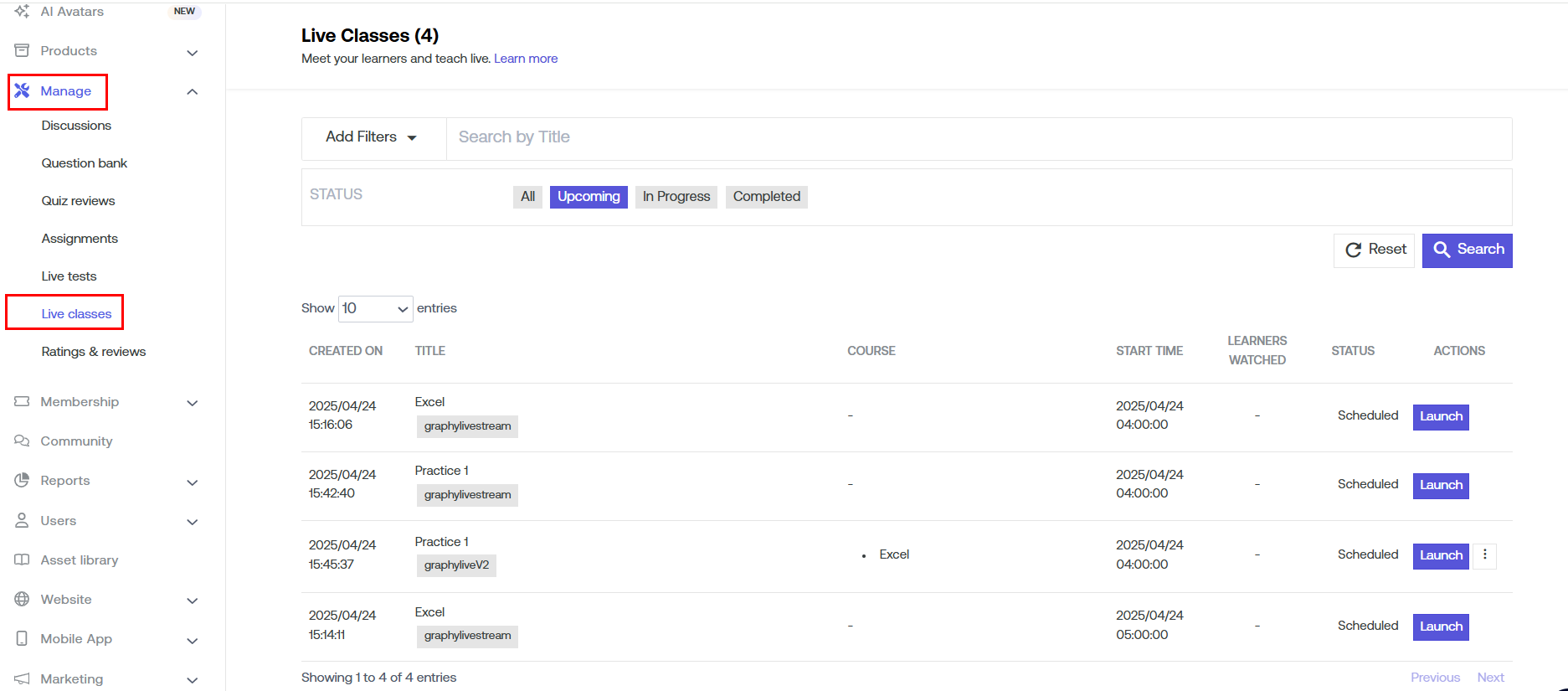 Visit your dashboard, go to "Manage" & select "Live Classes".