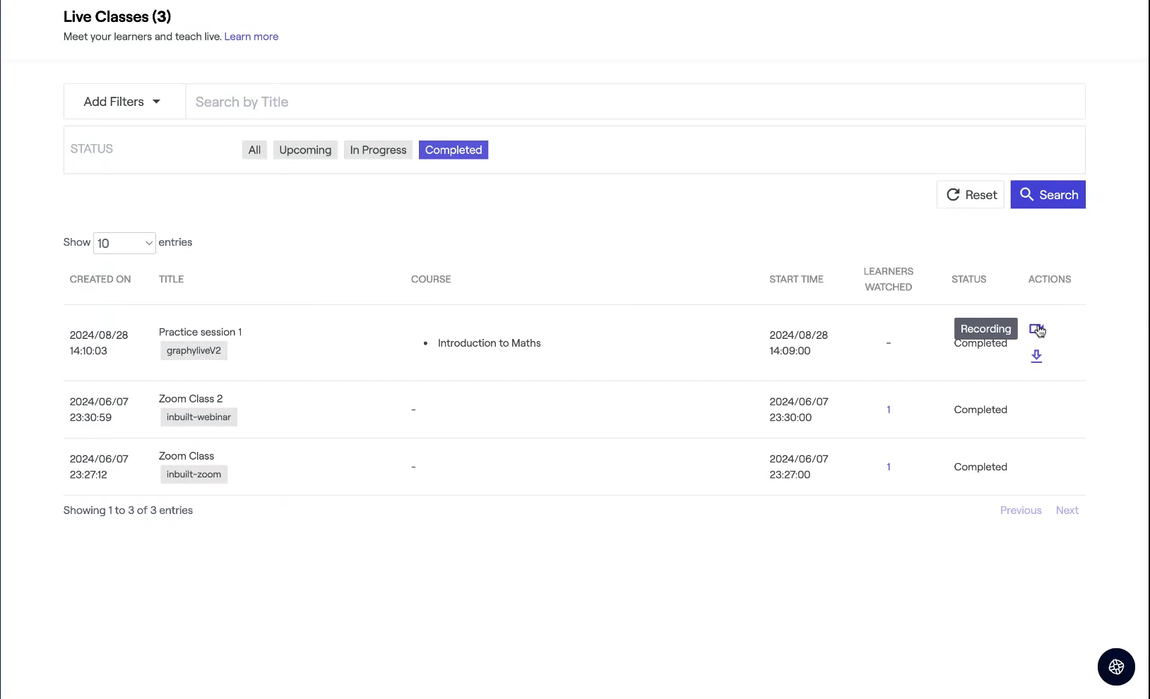 While conducting a Live Class, you have the option to record it. Once the Live Class has ended, you can view these recordings after 3-5 hours, depending on the length of your recording. You can keep these recordings for you or share them with your learners as well.
