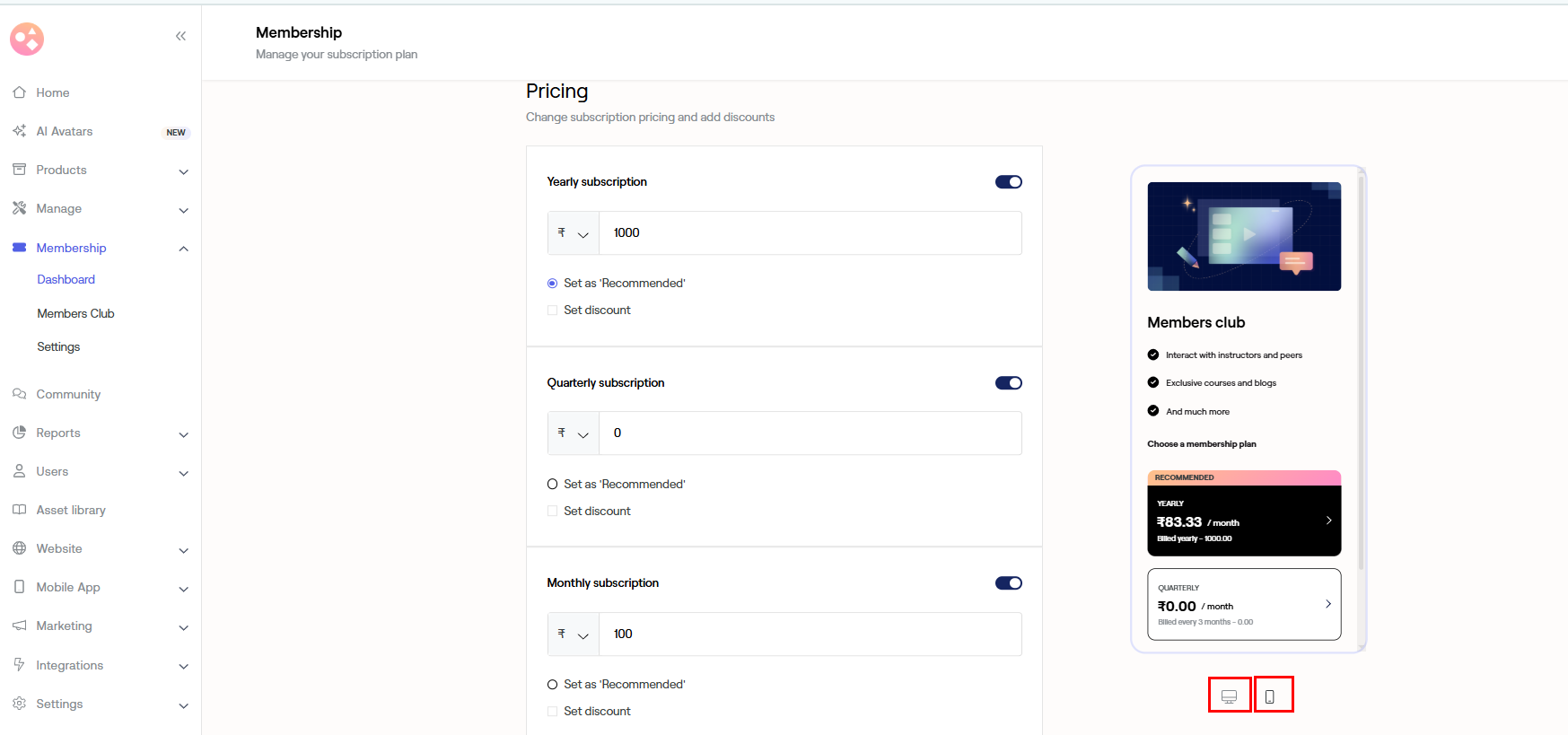 To get a preview of your desktop or mobile Membership screen, tap and swap between the Web and mobile icon.