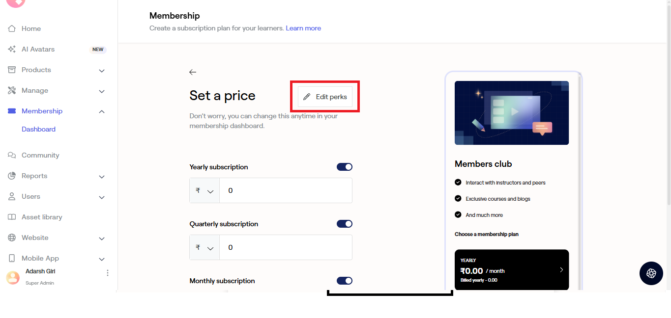 To make changes in the membership perks, go to Edit perks.