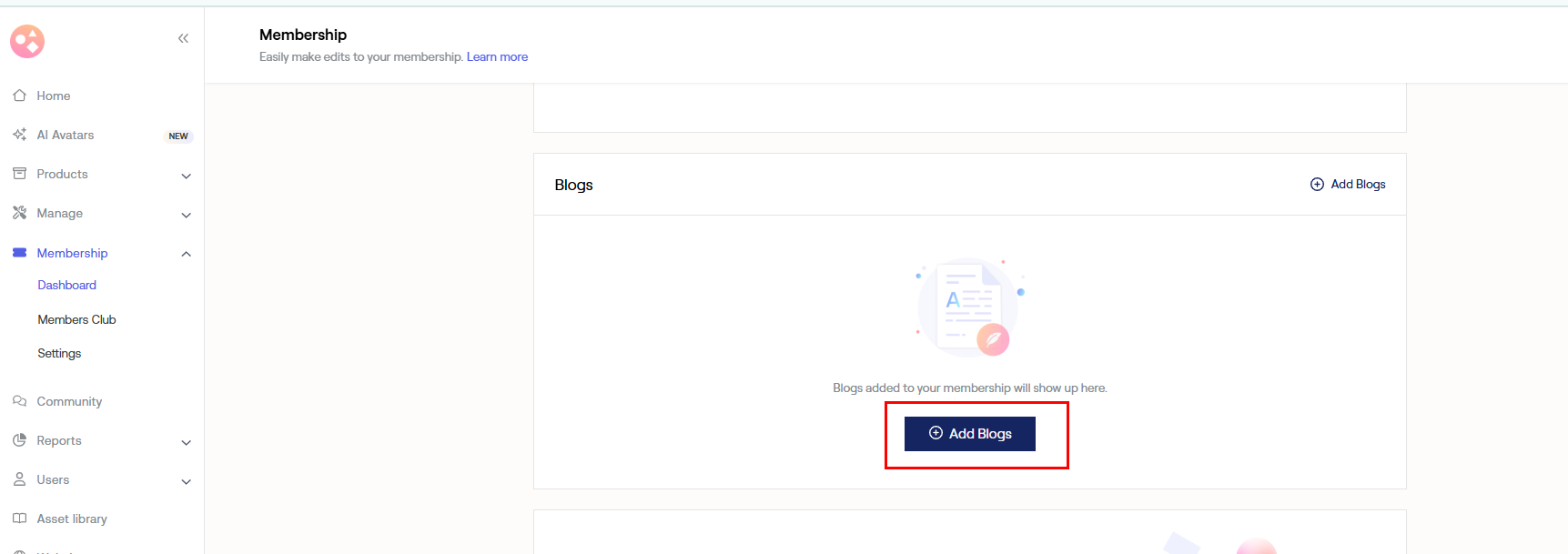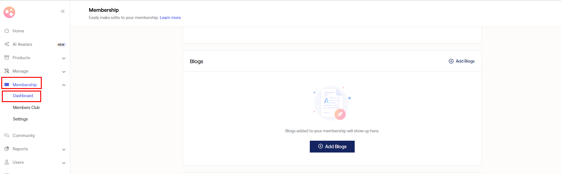 a) To add blogs to your website, go to Dashboard under Membership.