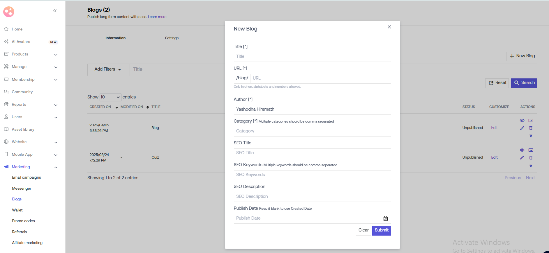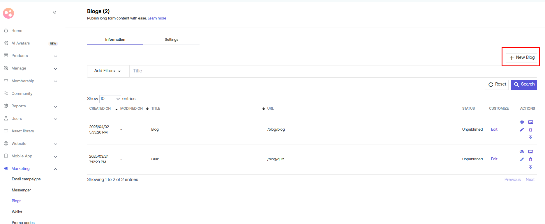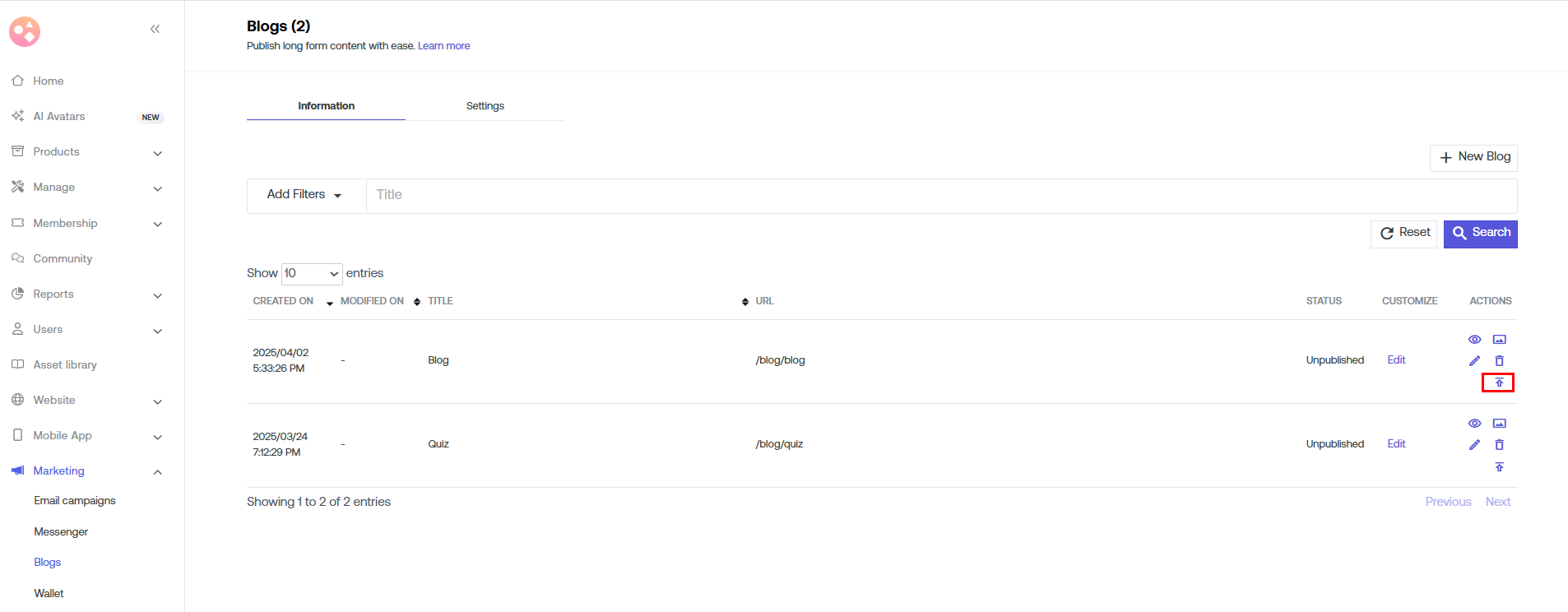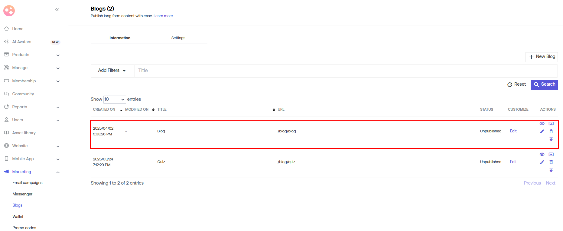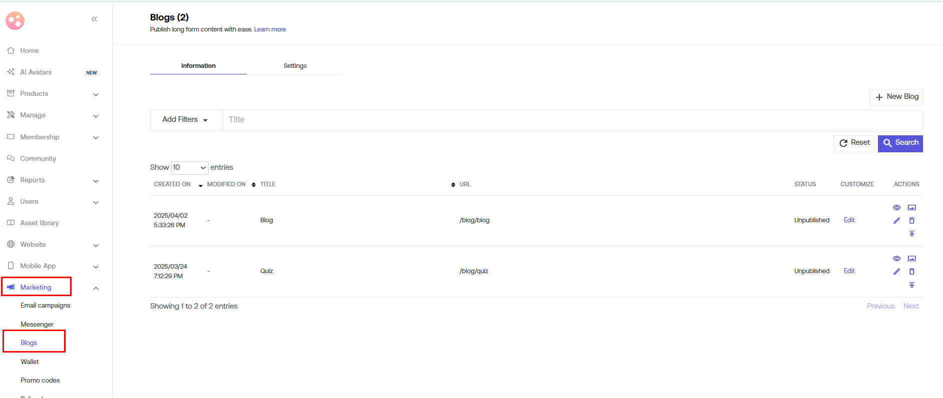 b) Go to Marketing > Blogs.